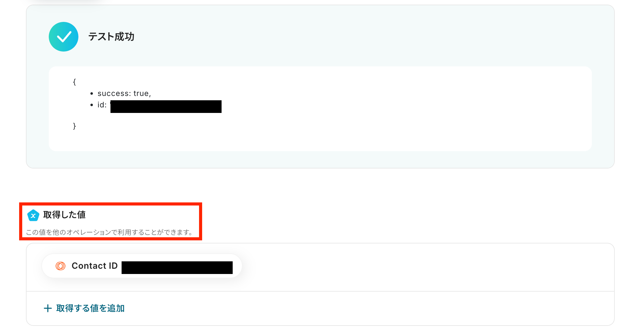 「テスト成功」と表示が出たら、取得した値 が取得されます。