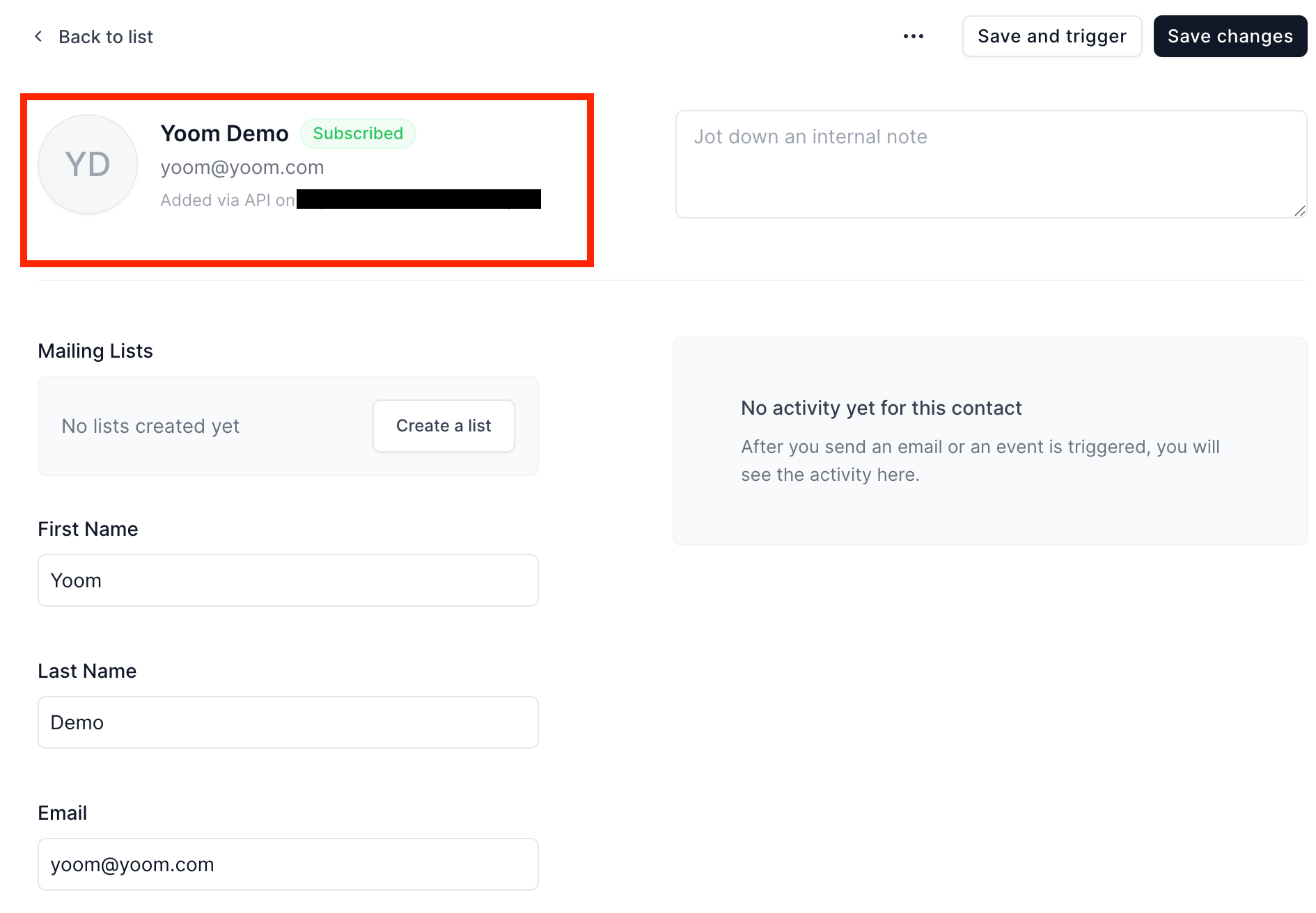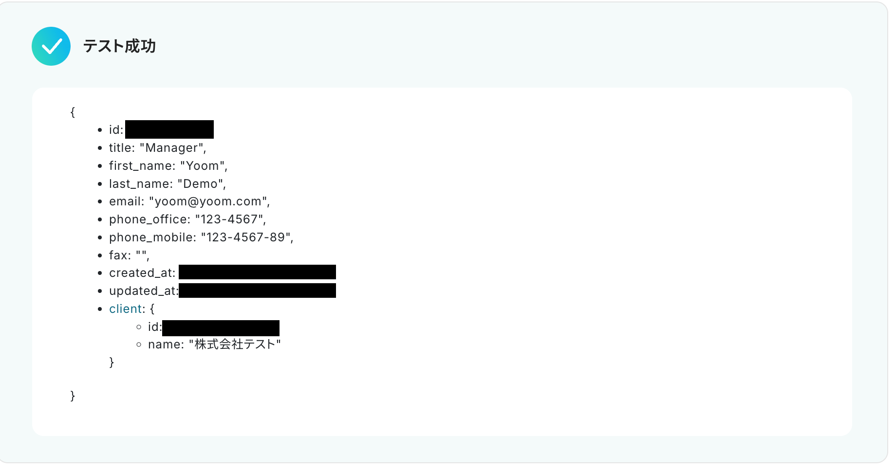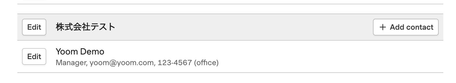 Harvest上でテストのためのコンタクトを作成します。 ※今回は以下の「株式会社テスト」のコンタクト情報である「Yoom Demo」をテストとして使用します!