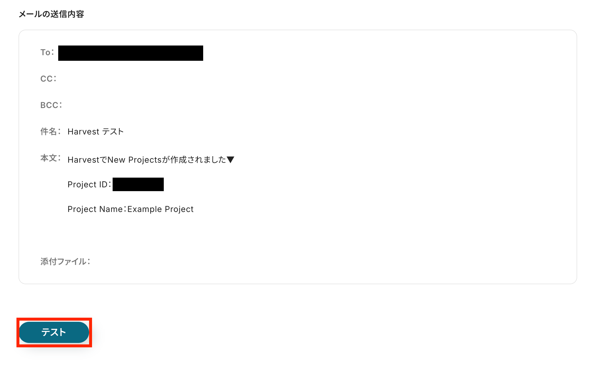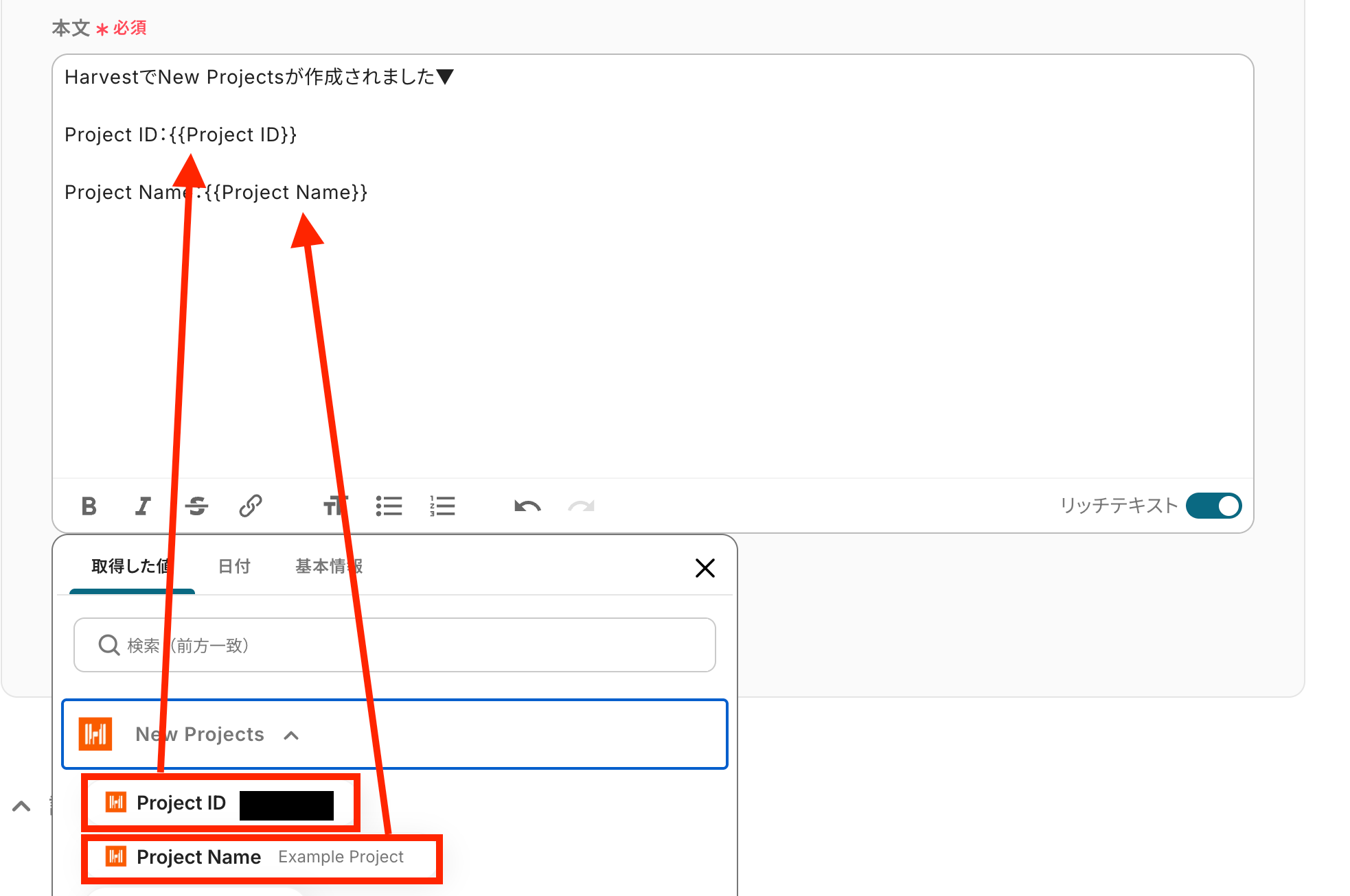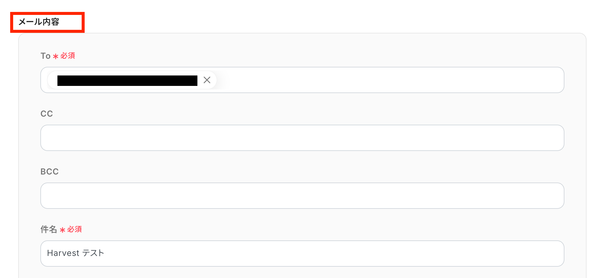 メール本文には、Harvestで取得した値を利用することが可能です。