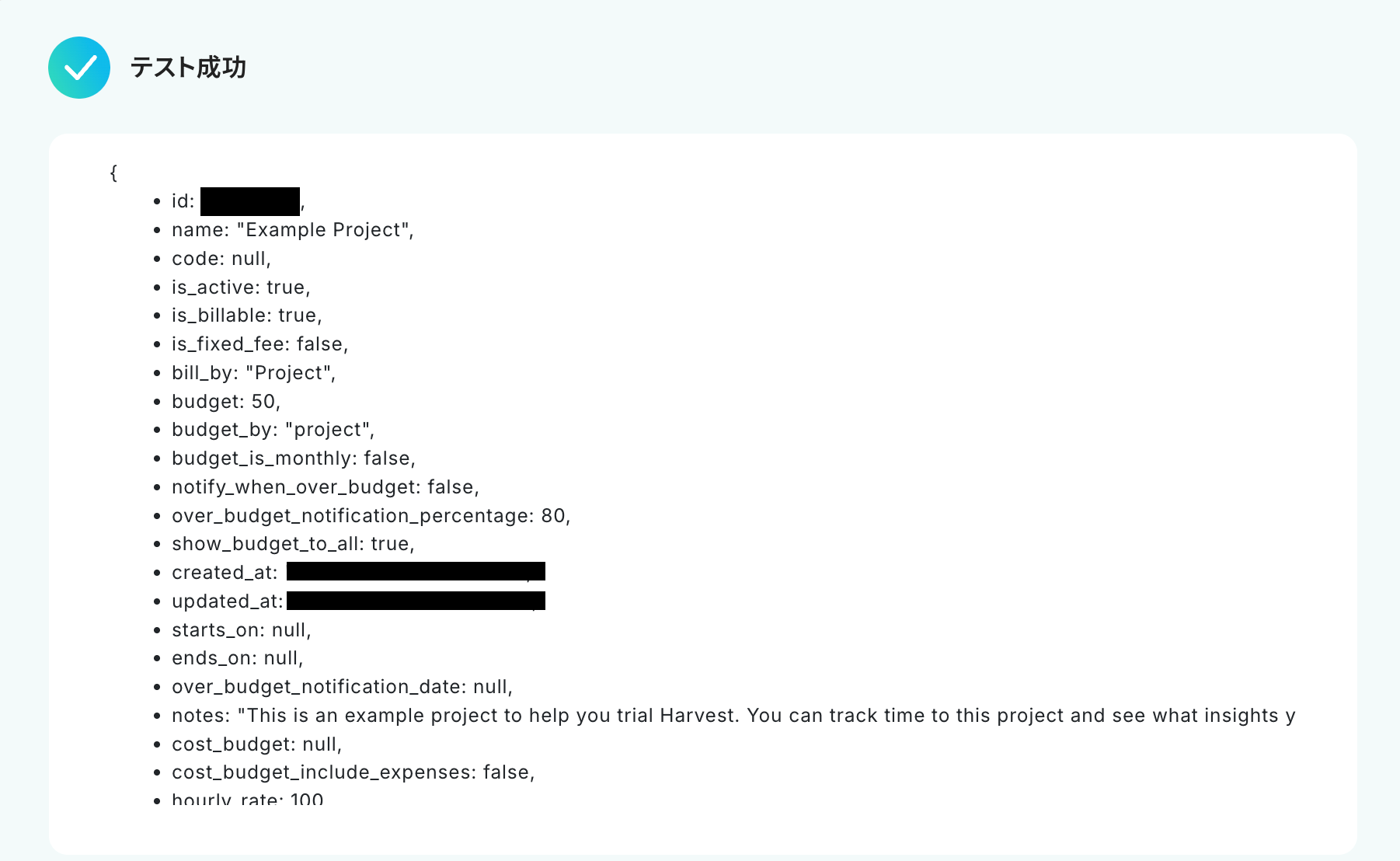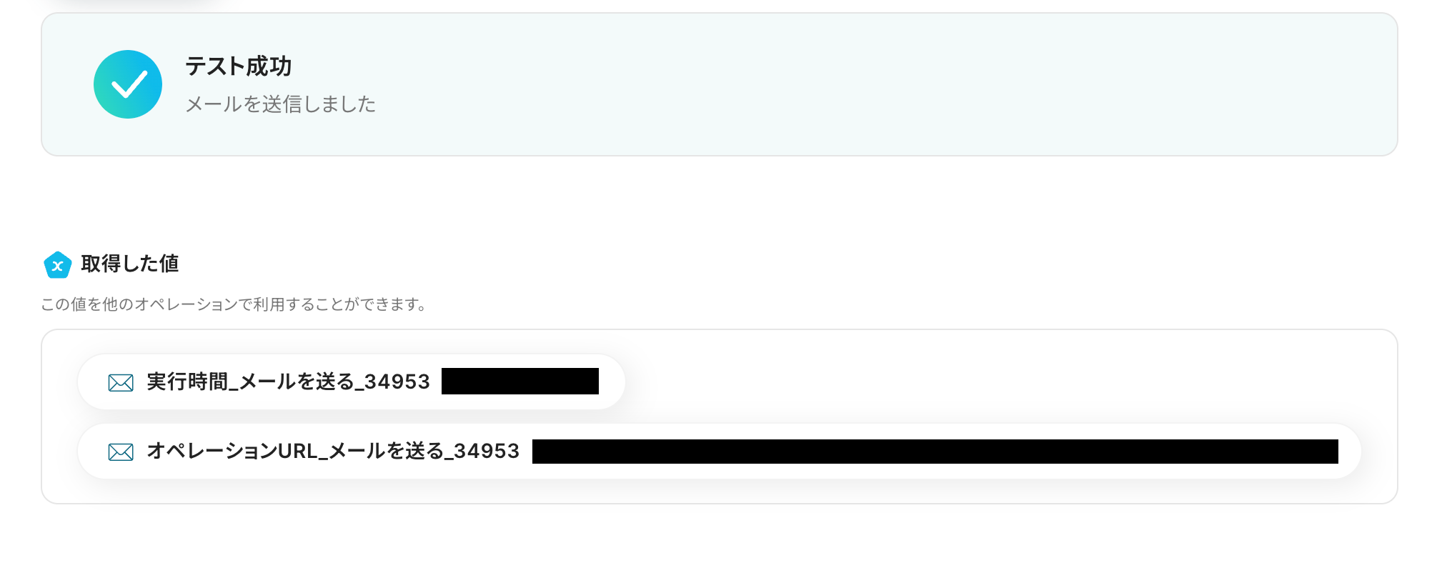 「テスト成功」と表示が出たら、取得した値が取得されます。