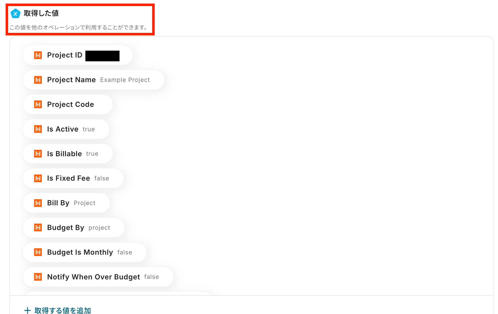 ※取得した値は、後続のオペレーション設定時の値としてご利用いただくことができ、フローボットを起動する度に変動した値となります。