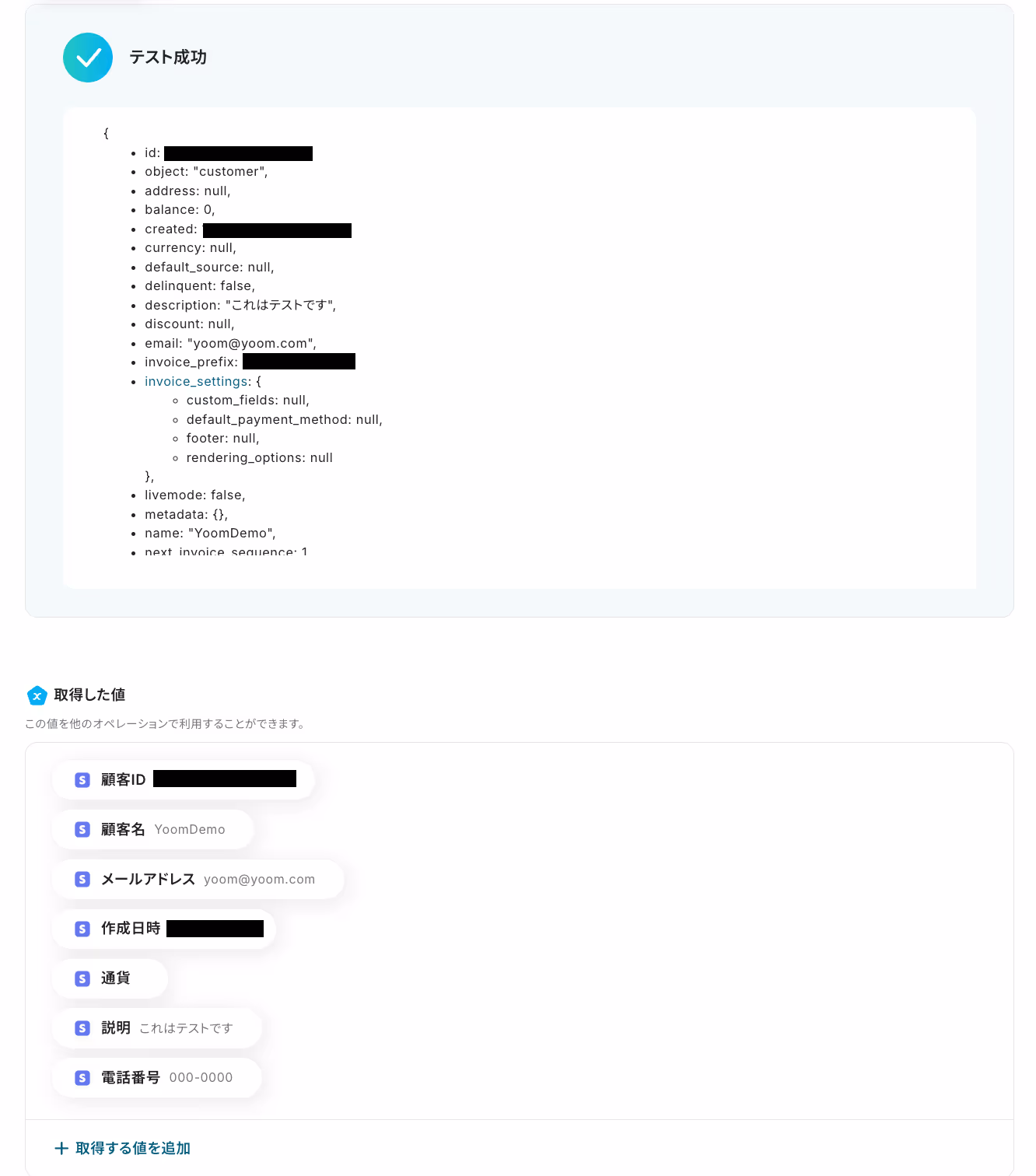 「テスト成功」と表示が出たら、取得した値にデータが反映されます。