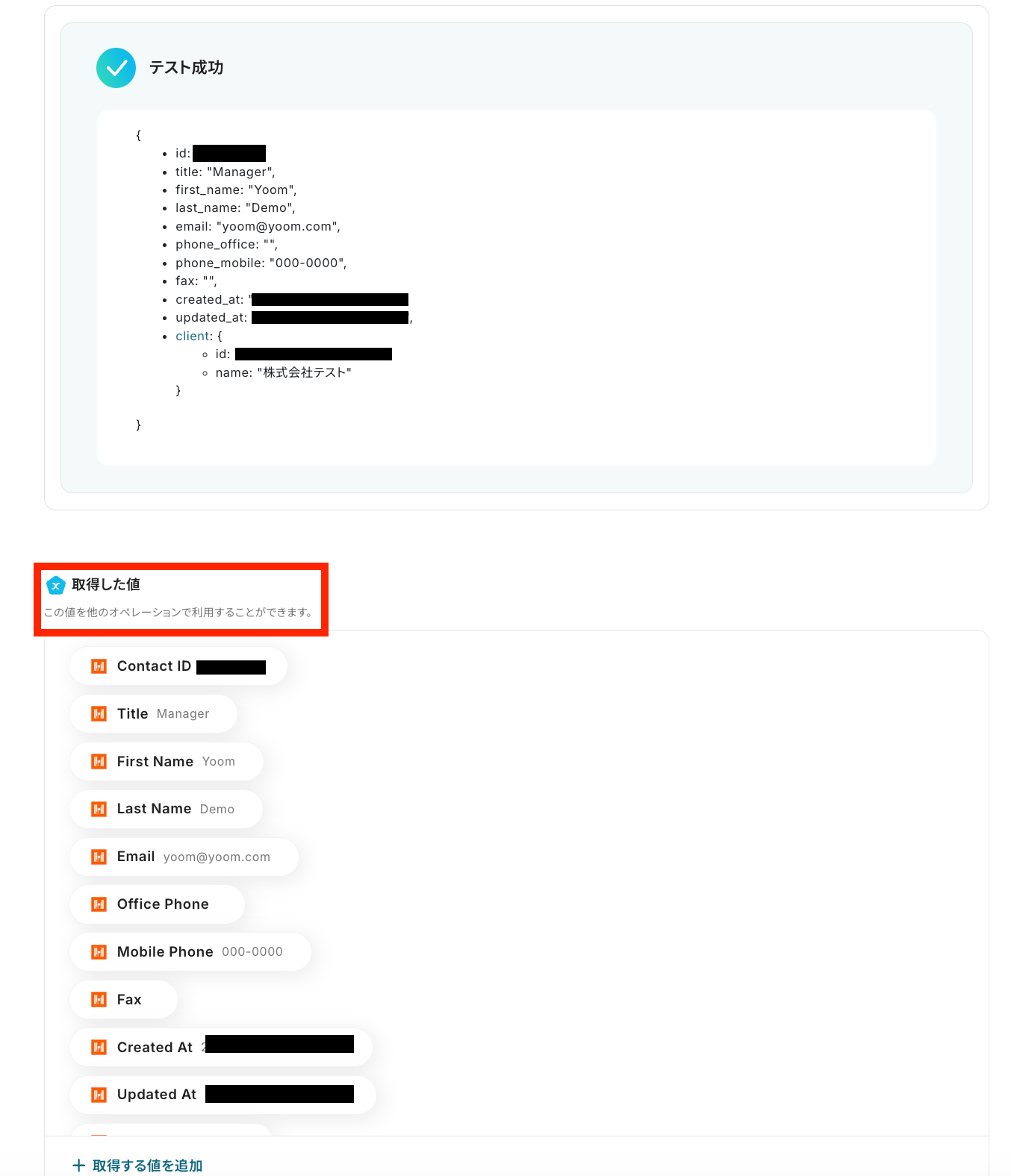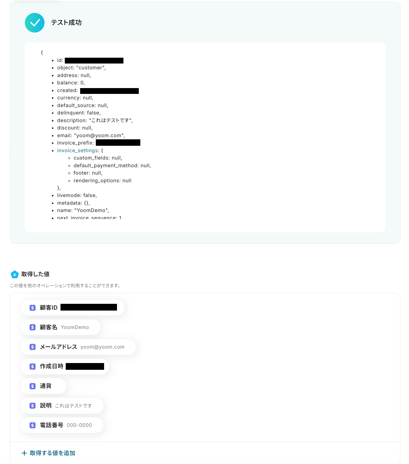 「テスト成功」と表示が出たら、取得した値 にデータが反映されます。
