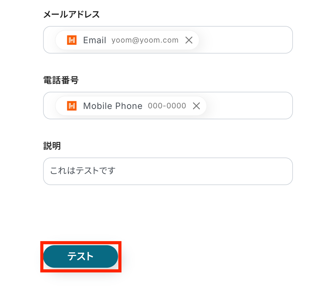 同様に、任意でメールアドレスや電話番号などを登録します。 全ての設定ができたら赤枠をクリックしてテストを実行しましょう!