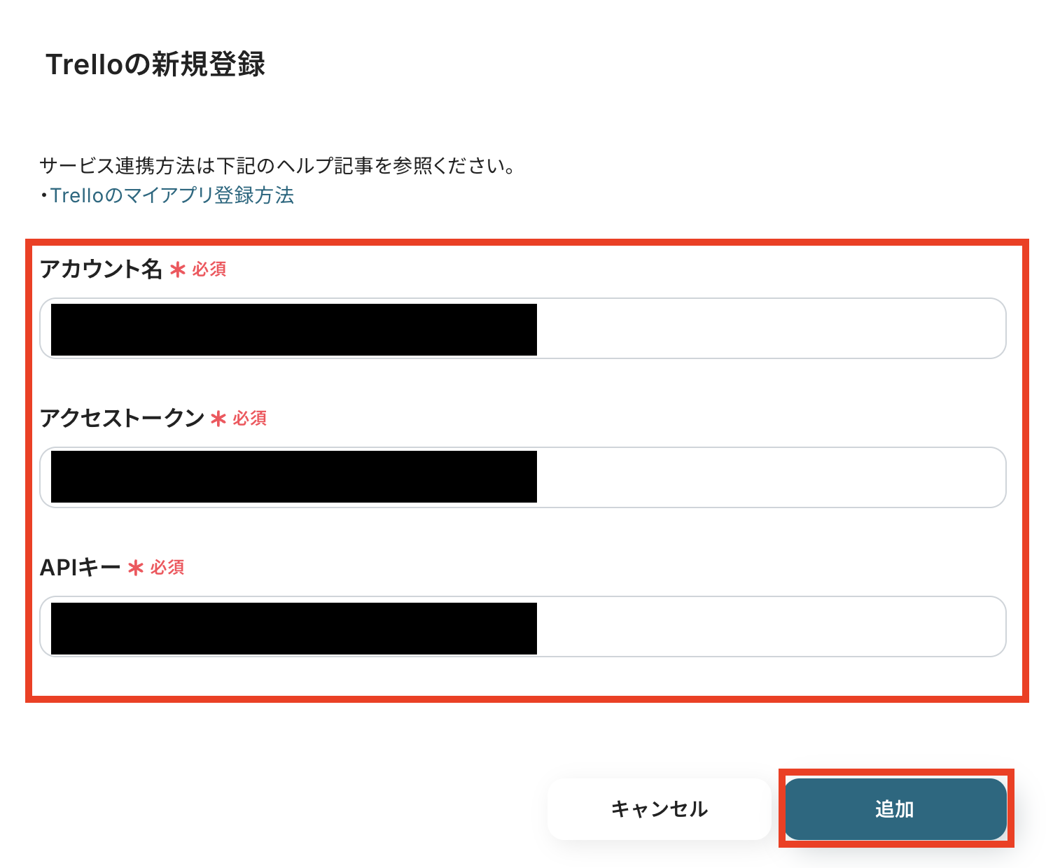 次の画面で、アカウント名、アクセストークン、APIキーを記入します。