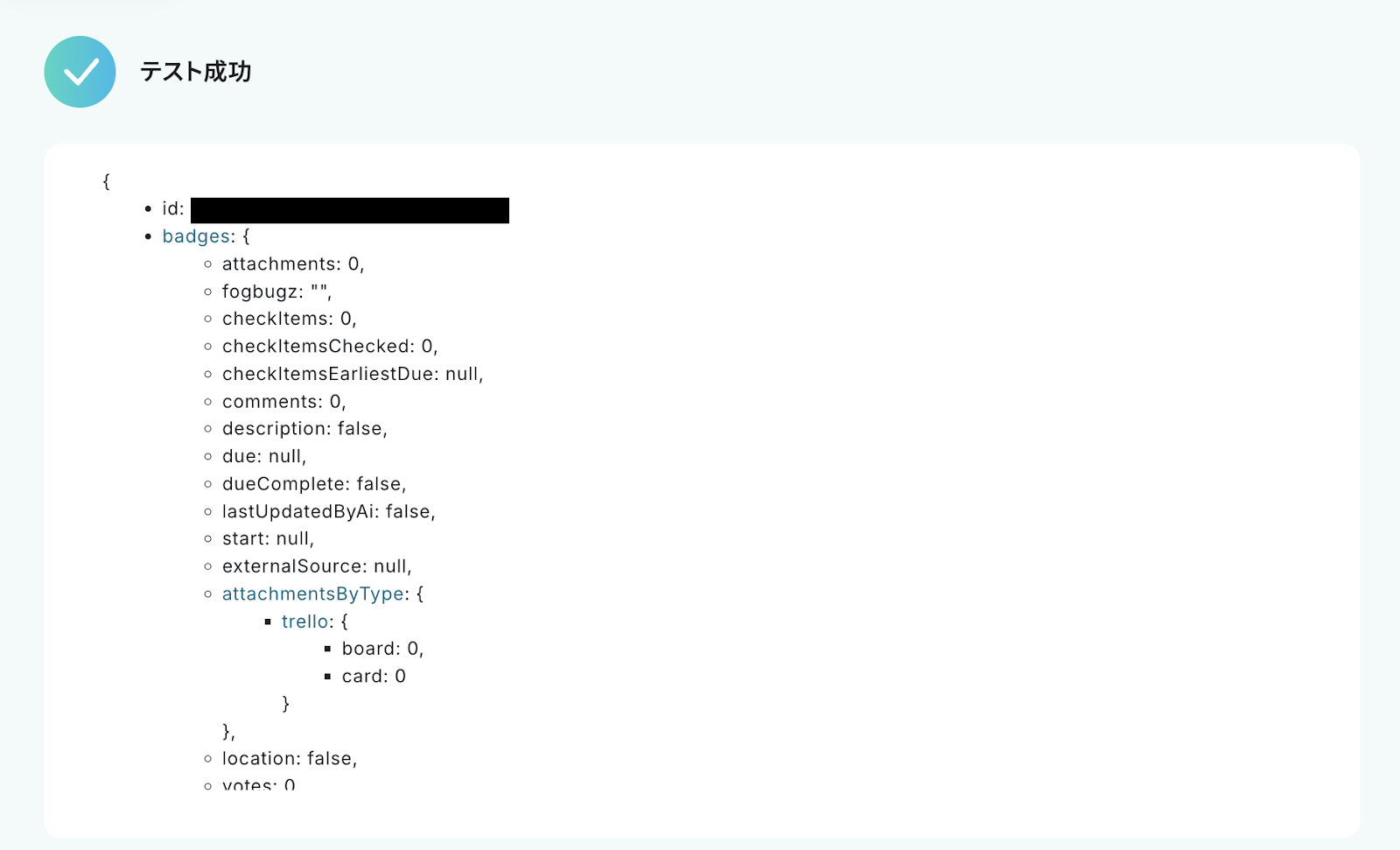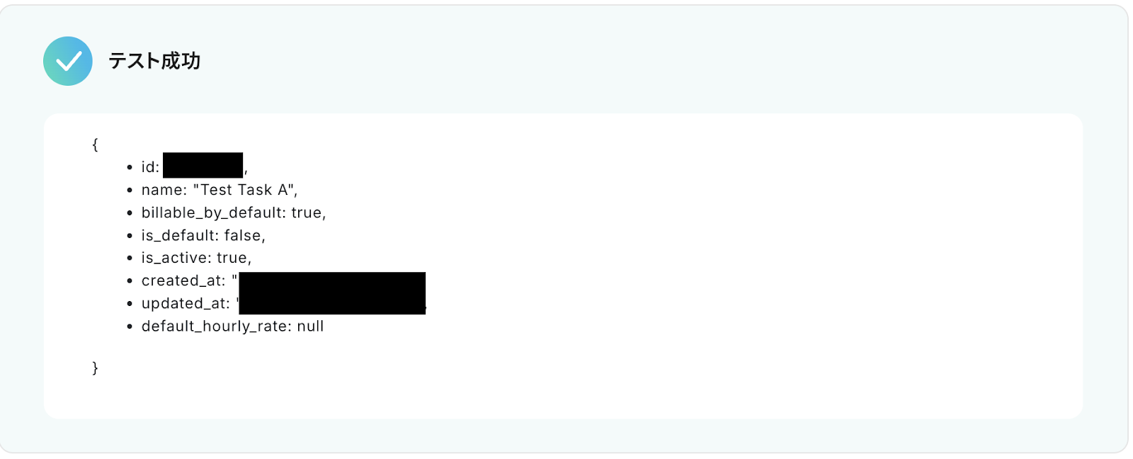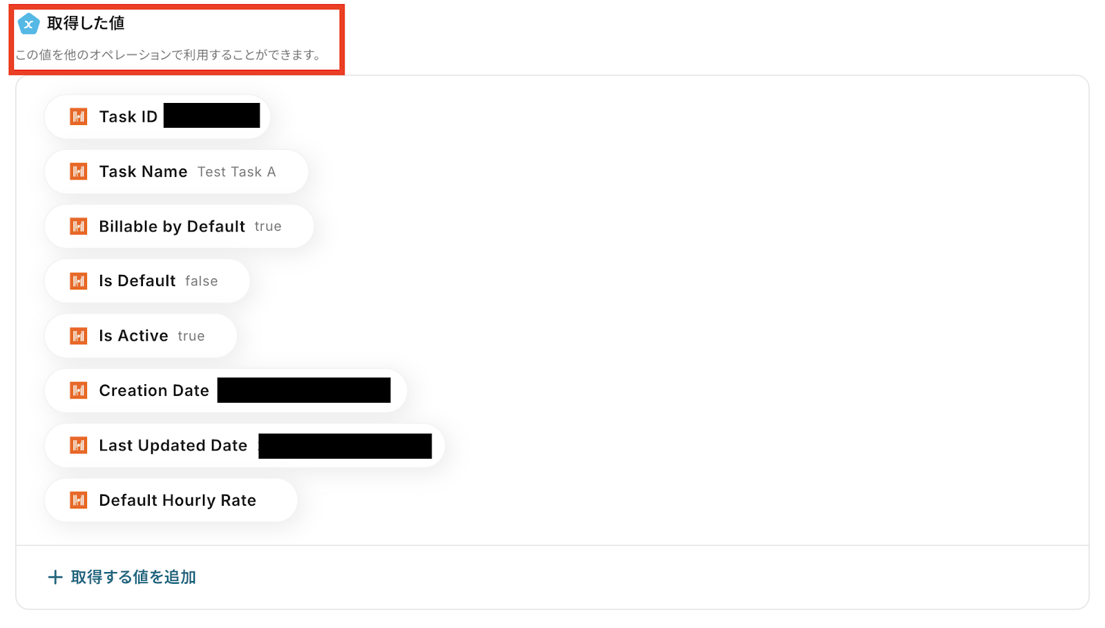 「テスト成功」と表示が出たら、アウトプット(取得した値)が取得されます。