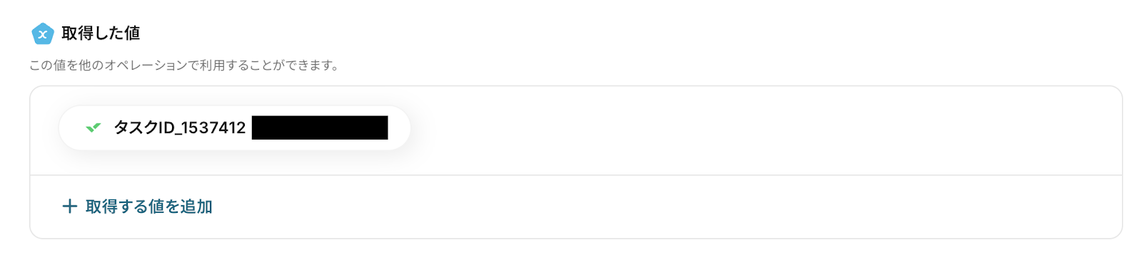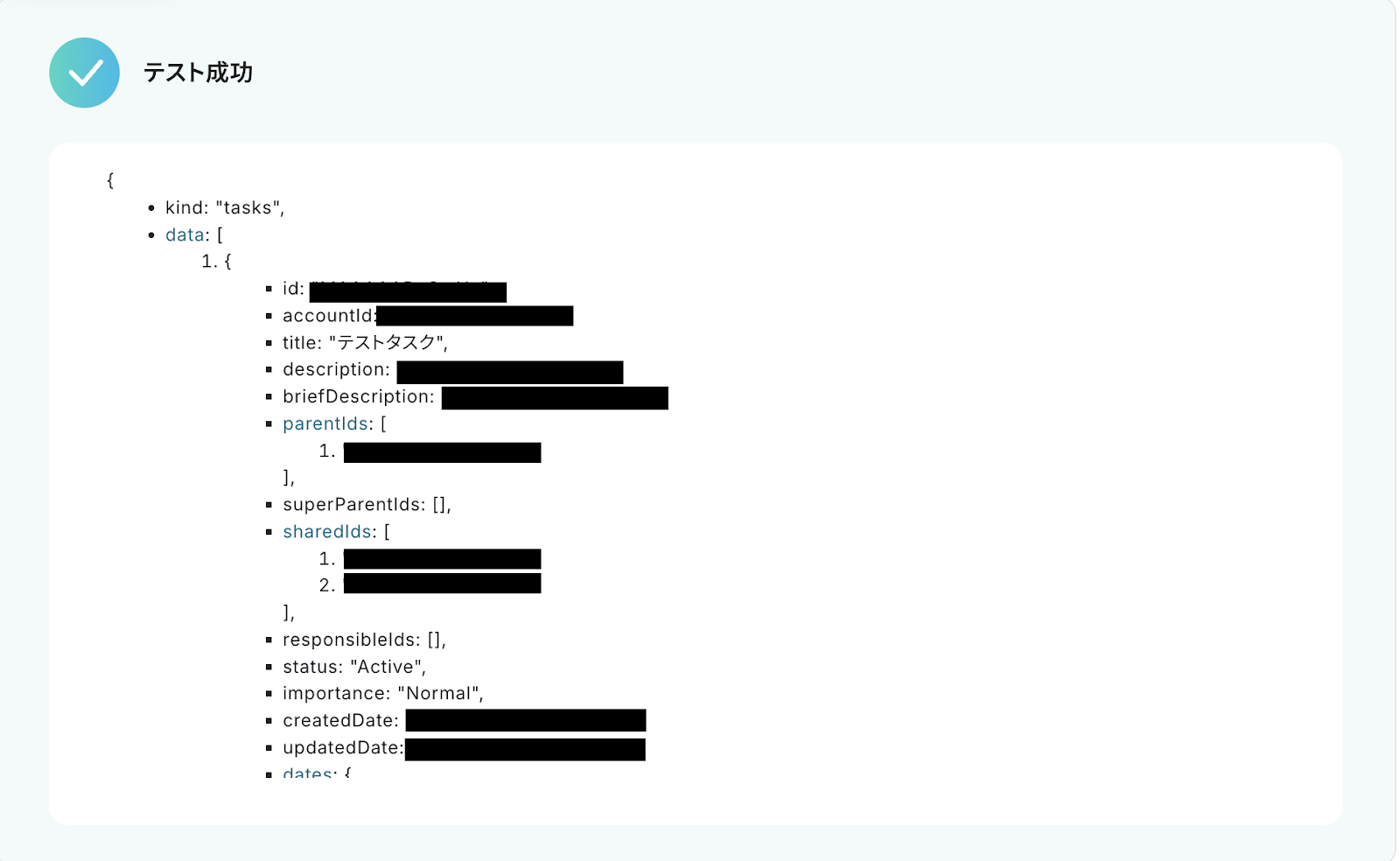 「テスト成功」と表示が出たら、アウトプット(取得した値)が取得されます。