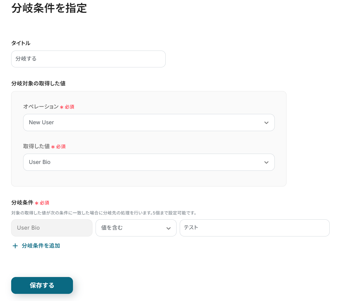 たとえば、以下のように設定するとUser Bioに「テスト」という文字が含まれている場合のみ通知されるようになります。
