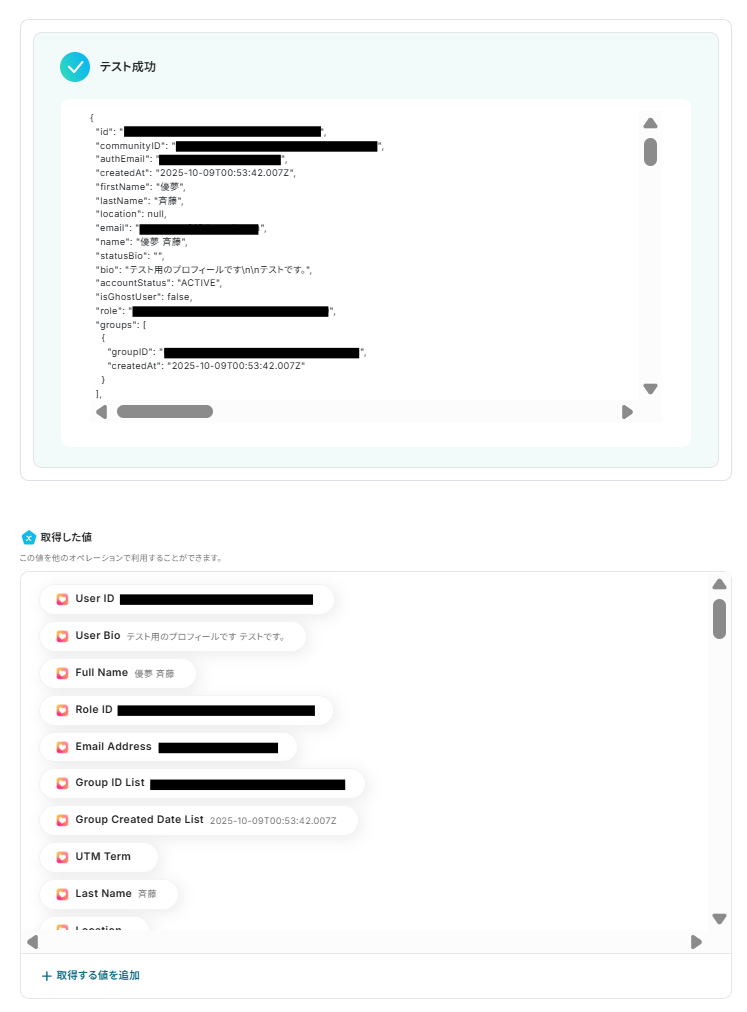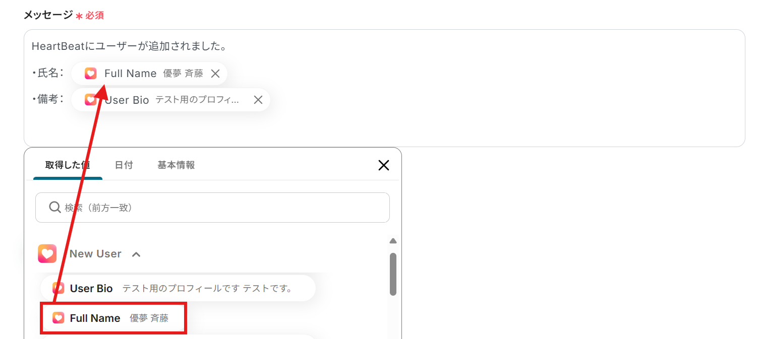 テストが成功すると、「テスト成功」という画面が表示され、HeartBeatから取得した情報をYoomで引用できるようになります。
