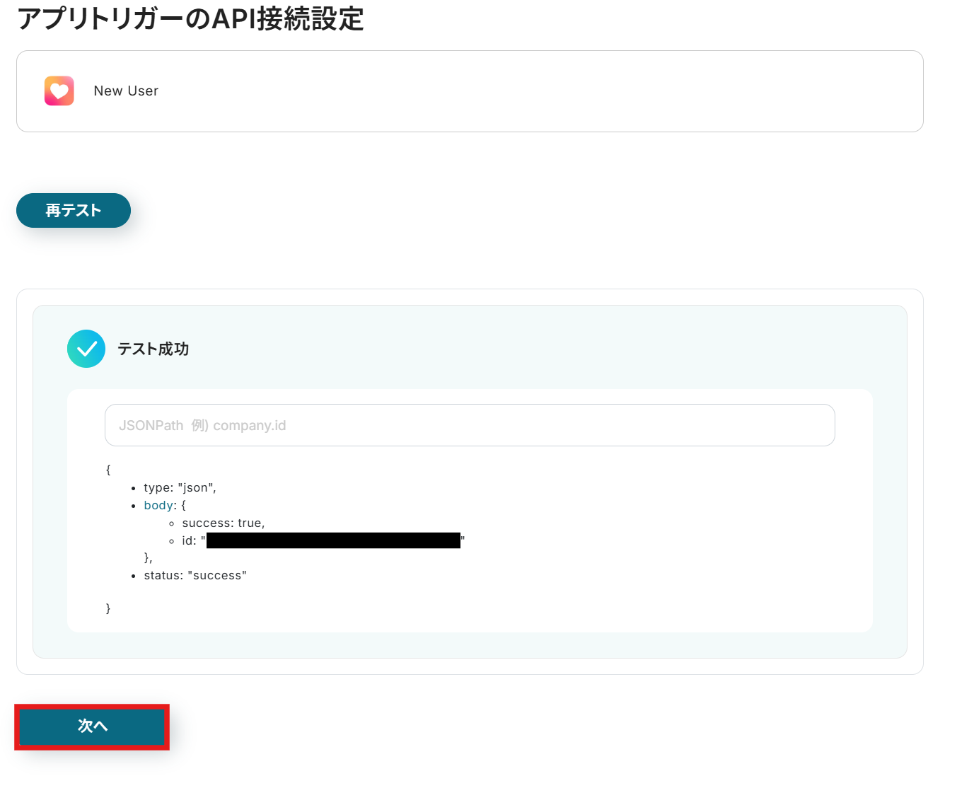 「テスト成功」という画面が表示されたら、「次へ」をクリックします。