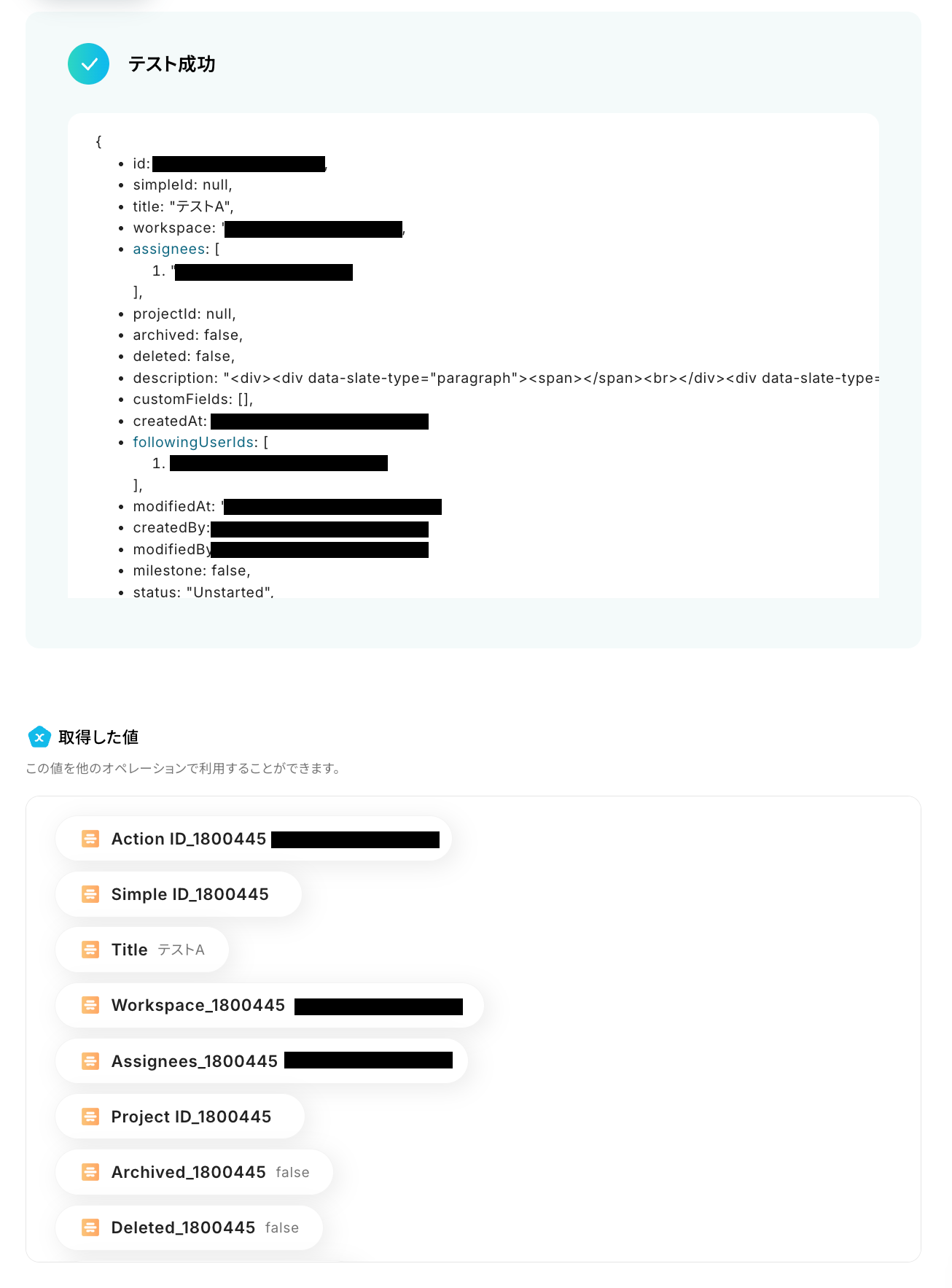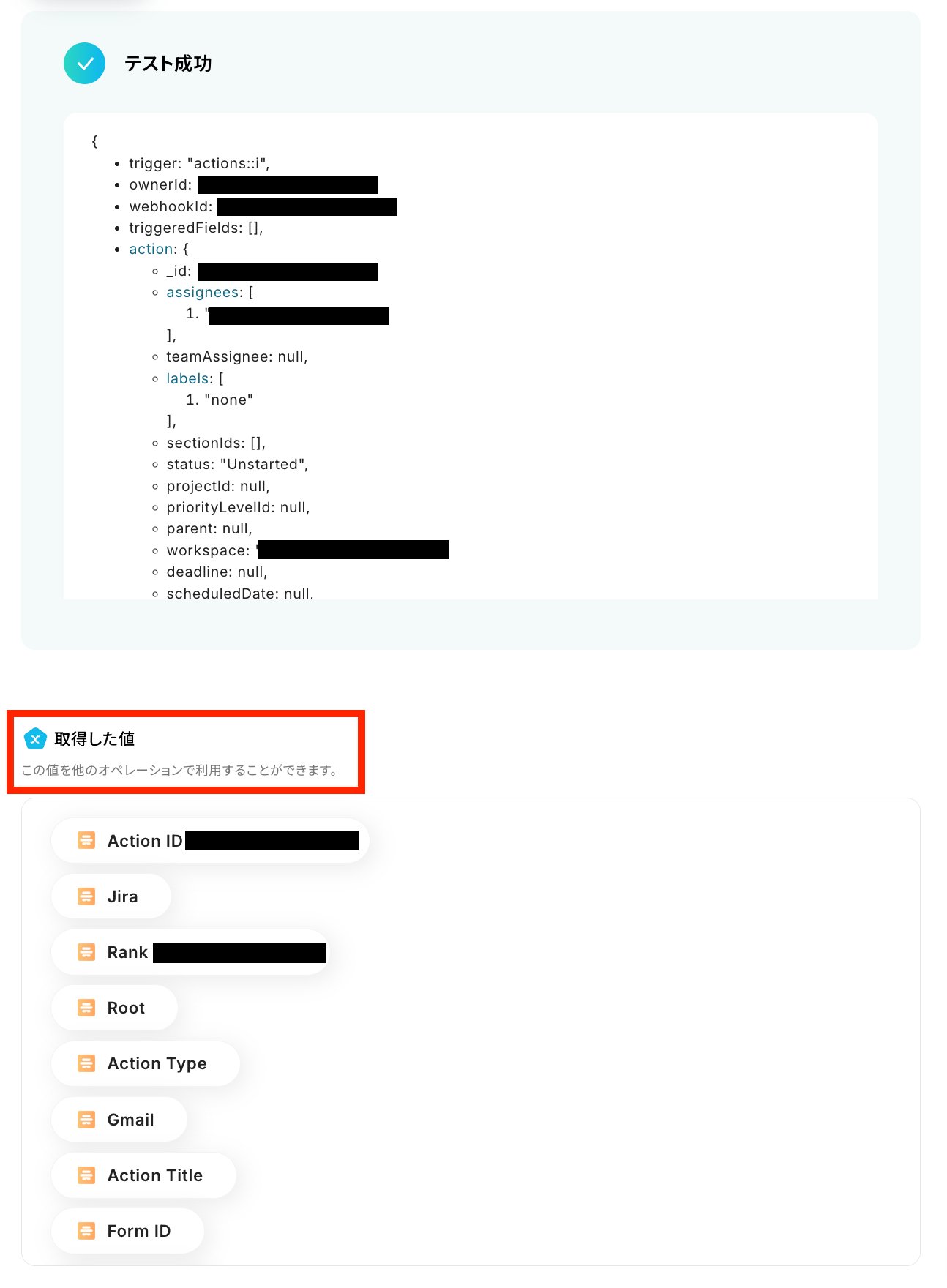 「テスト成功」と表示が出たら、取得した値 に値が反映されます。 ※取得した値とは、トリガーやオペレーションにて取得した値を指します。 取得した値は、後続のオペレーション設定時の値としてご利用いただくことができ、フローボットを起動する度に、変動した値となります。