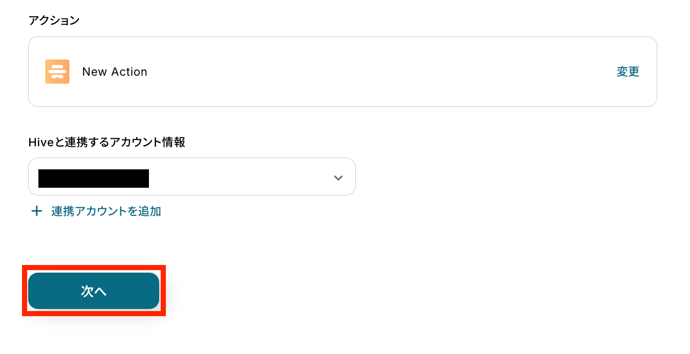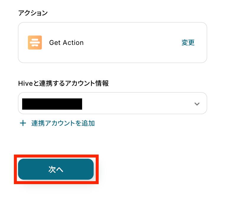 ステップ4:Hiveのアクション設定 次に、Hiveのアクション情報を取得していきます。 2つ目の赤枠をクリックします。