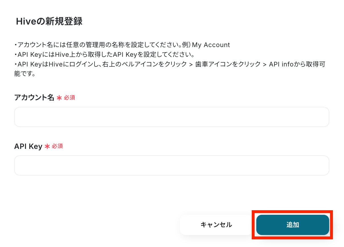 アカウント名とAPI Keyを記入して、「追加」ボタンをクリックしましょう!