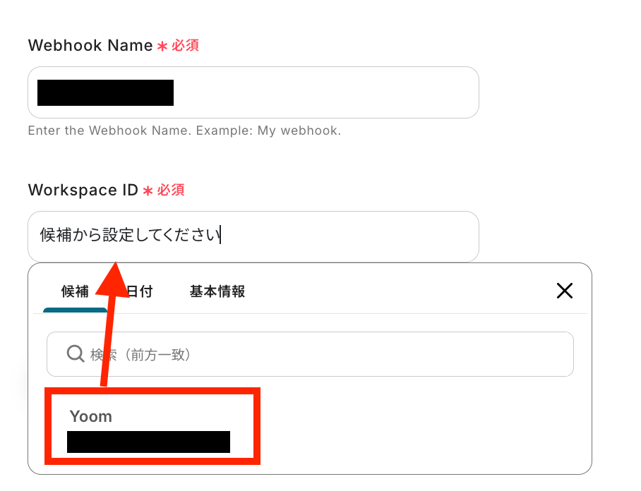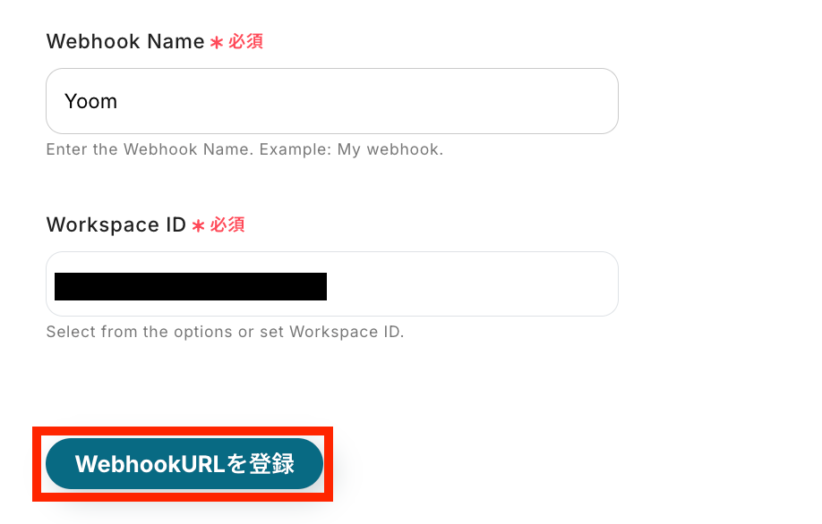 Webhookを登録するため、名前を手動で設定して、Workspace IDを候補から選択します。