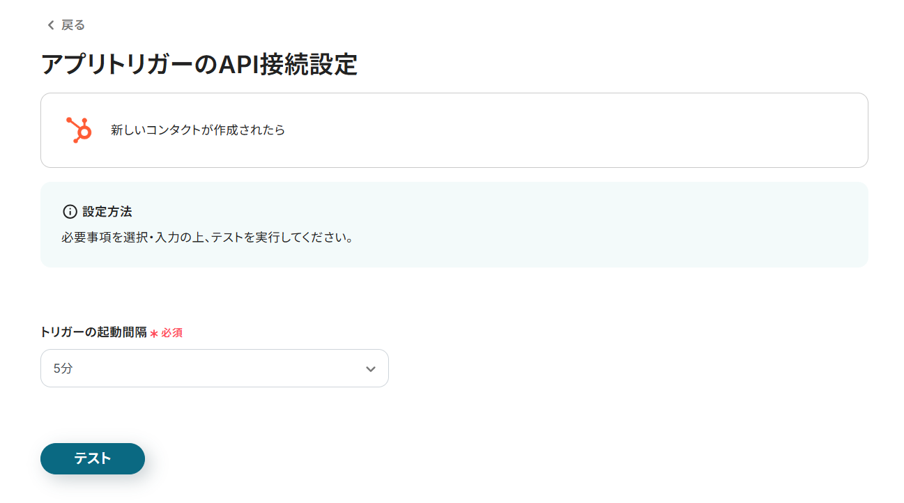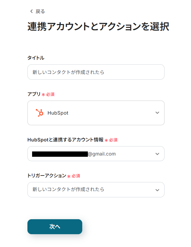 HubSpotのトリガーで「新規コンタクトが登録されたら」を選択し、連携アカウントを設定してください。