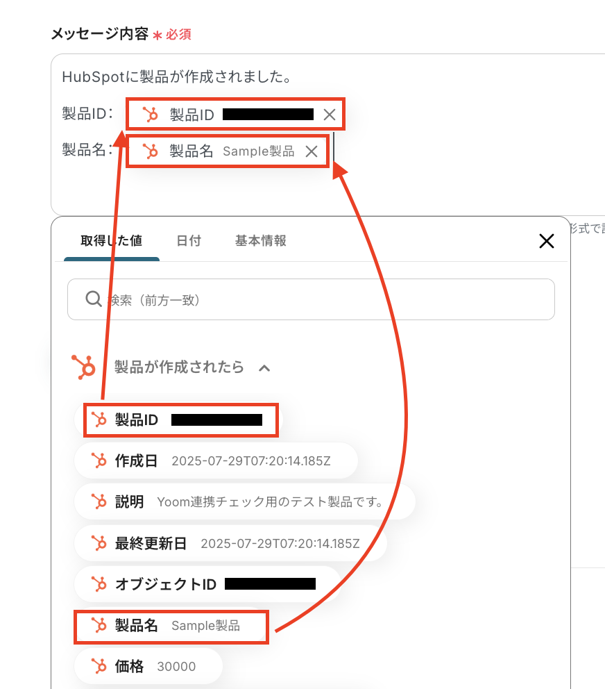 「HubSpotに製品が作成されました。」など、毎回同じ文章を使用するテキストは直接入力し、「製品ID」や「製品名」といったHubSpotの情報を引用する部分は、アウトプットを使って設定しましょう。