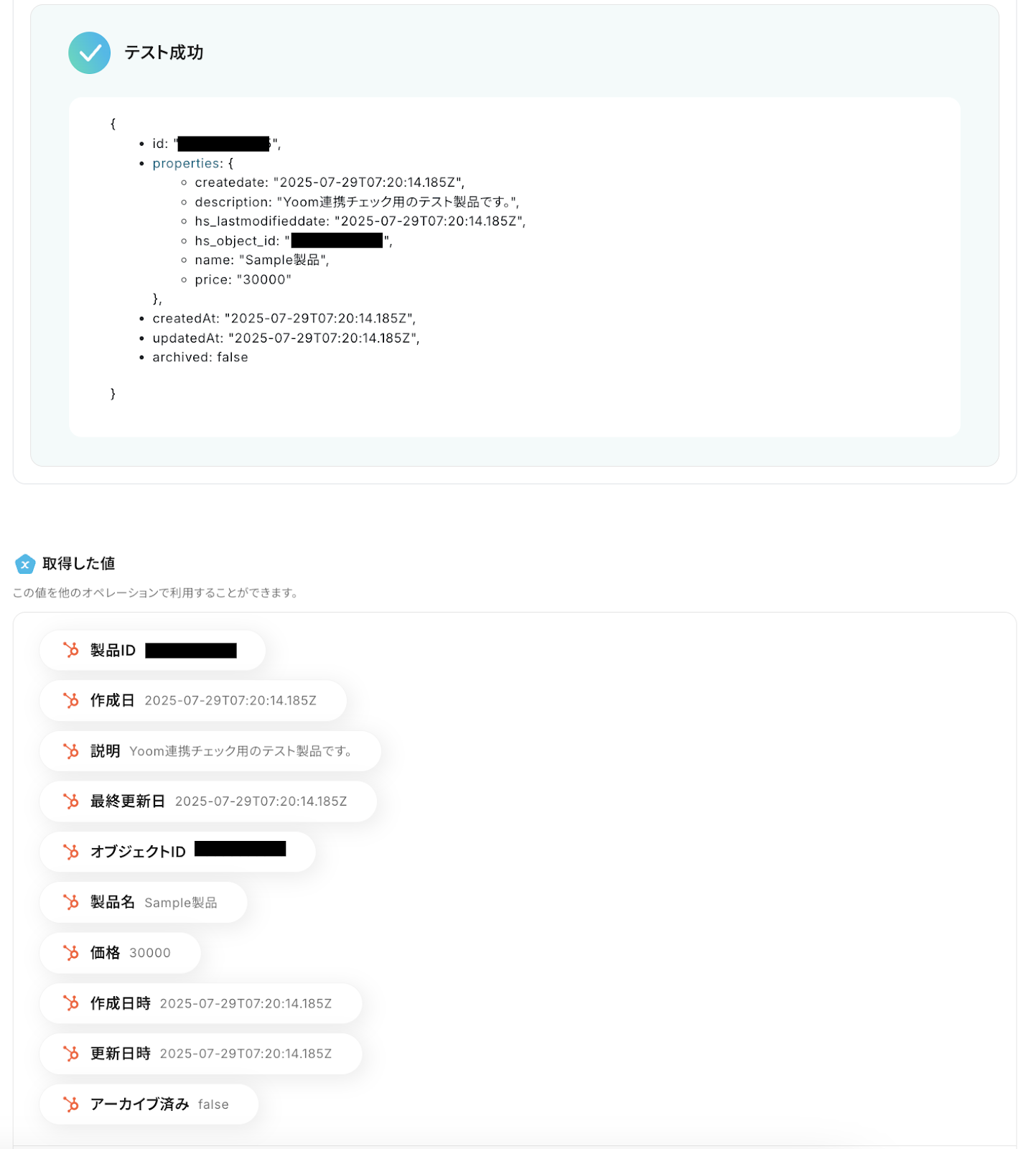 テストが成功すると、先ほど作成した製品の情報がアウトプットとして「取得した値」に抽出されるので、内容を確認しましょう。