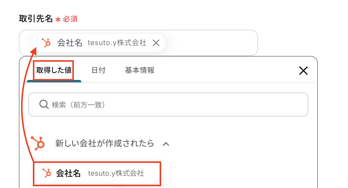 必須項目やfreee会計に登録したい項目を、HubSpotの取得した値から選択しましょう。