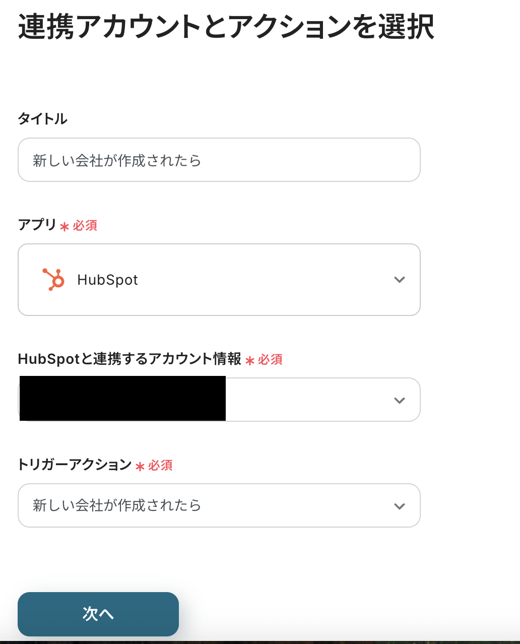 タイトルを変更したい場合は入力し、HubSpotと連携するアカウント情報とトリガーアクション(新しい会社が作成されたら)を確認して次へをクリックしましょう。