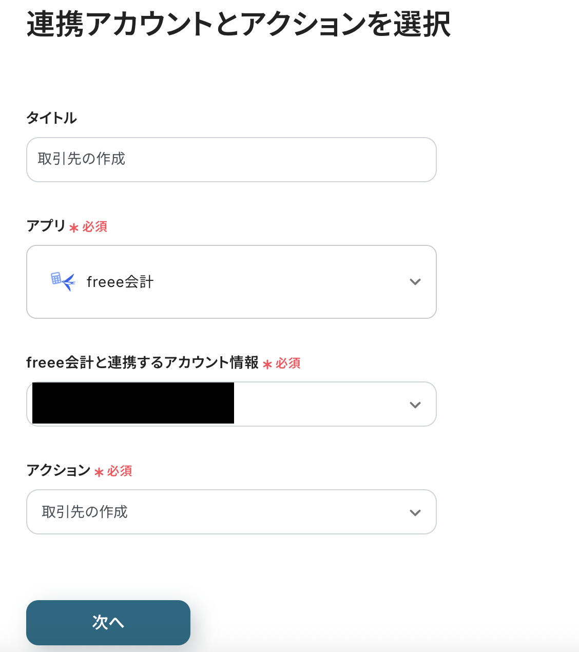 タイトルを変更したい場合は入力し、freee会計と連携するアカウント情報とアクション(取引先の作成)を確認し、次へをクリックしてください。
