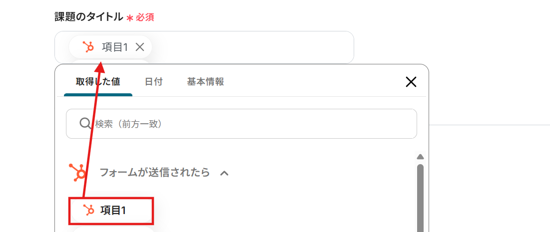 課題のタイトル:入力欄をクリックすると、HubSpotの情報を引用できます。