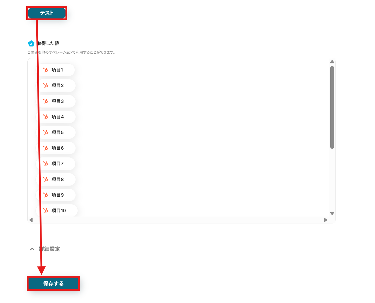テストが成功すると、「テスト成功」という画面が表示され、HubSpotから取得した情報を引用できるようになります。