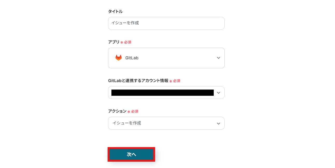 アクションに「イシューを作成」を選んだら、「次へ」をクリックします。