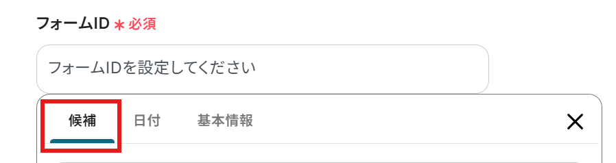 フォームID:入力欄をクリックすると候補が表示されるので、その中から選択しましょう。