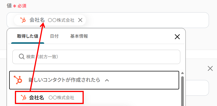 - 値:入力欄を選択し、前のステップで取得したアウトプットを選びましょう。
