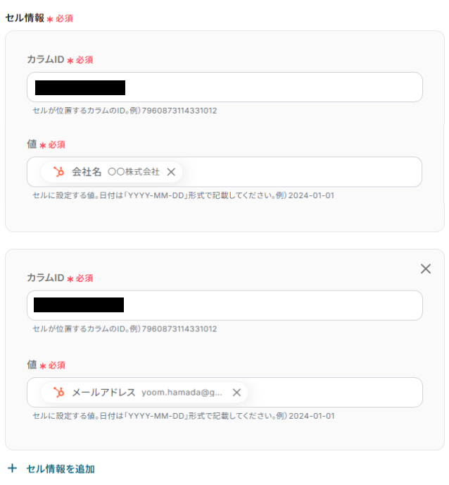 セルに反映させたい情報の数だけ、カラムIDと値を入力してください。