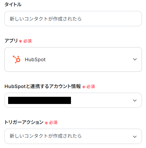 こちらの画面は設定されていますが、タイトルを変更したい場合は入力し、HubSpotと連携するアカウント情報とトリガーアクション「新しくコンタクトが作成されたら」を確認したら次へをクリックしてください。