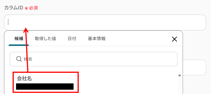 - カラムID:こちらも入力欄をクリックし、候補からデータを反映させたいカラムを選びましょう。