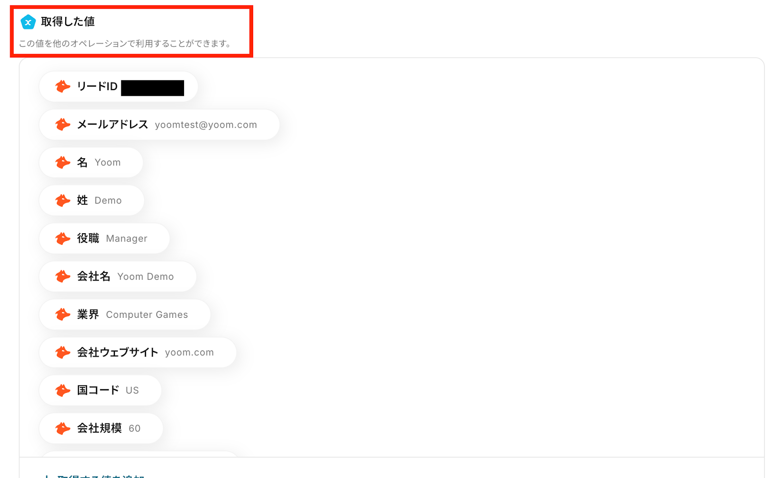 取得したアウトプットは、後続のオペレーション設定時の値としてご利用いただくことができ、フローボットを起動する度に、変動した値となります。