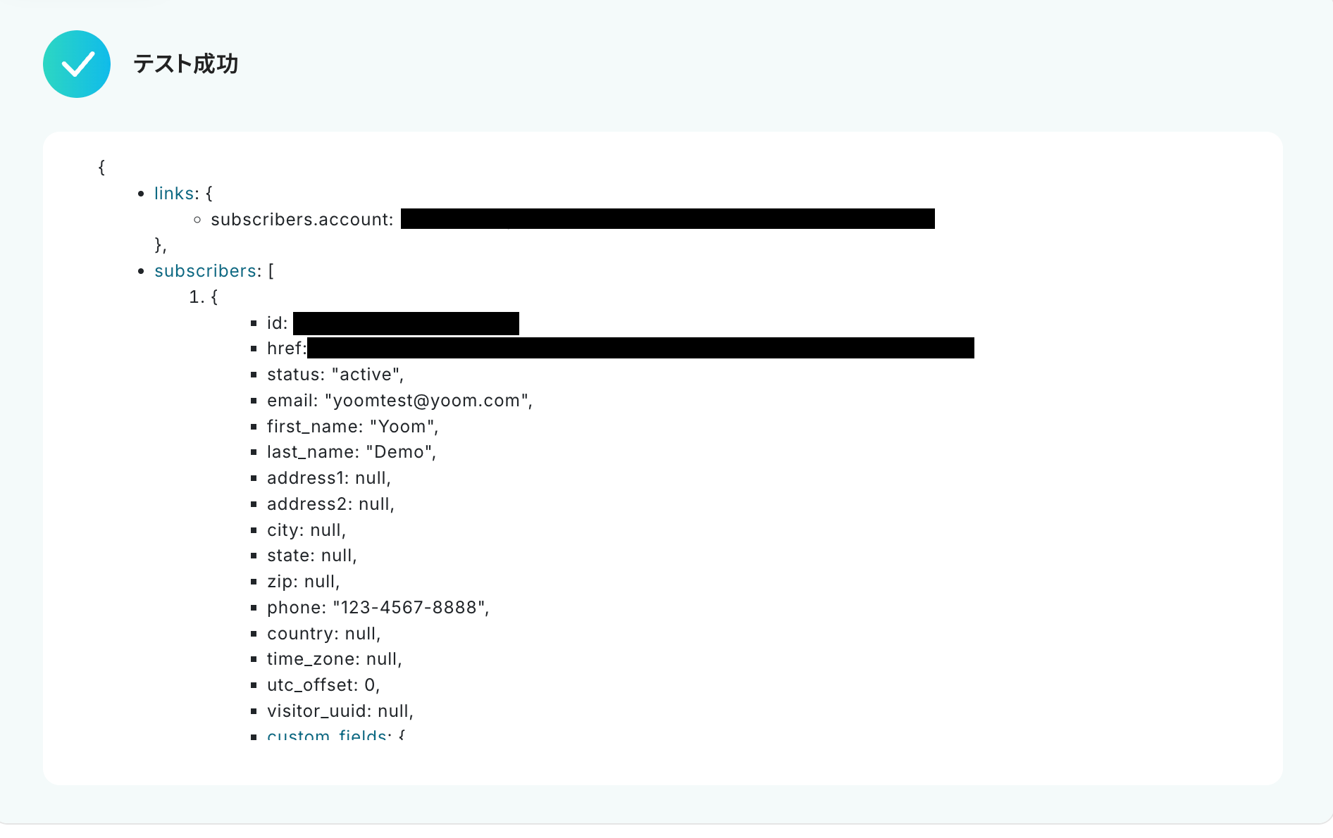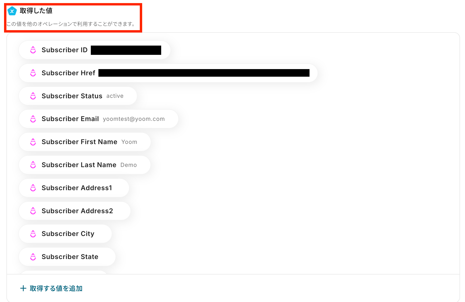「Create Subscriber」アクションにある項目に該当するものを、取得した値などから設定することが可能です。