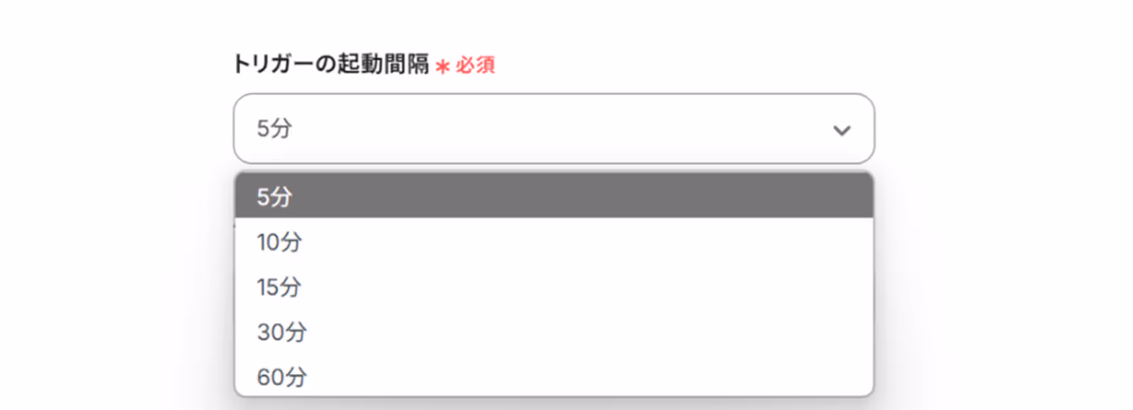 トリガーの起動間隔はプルダウンより5分、10分、15分、30分、60分の間隔から選択してください。