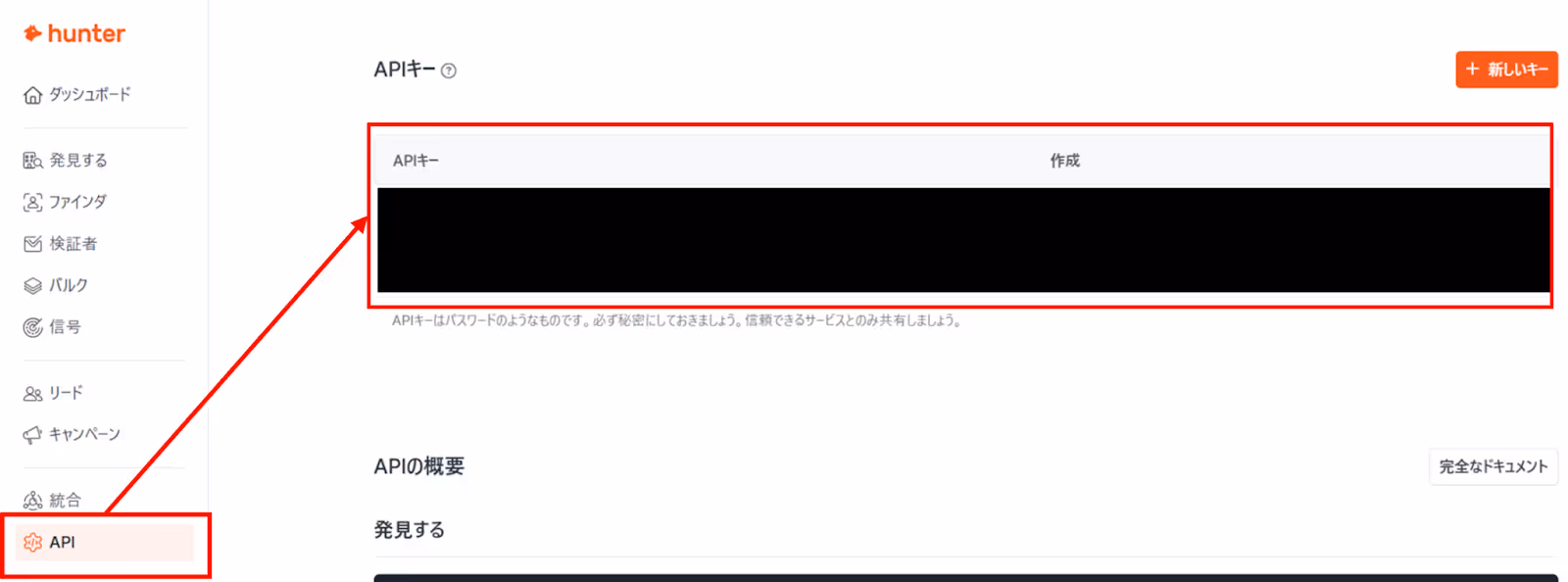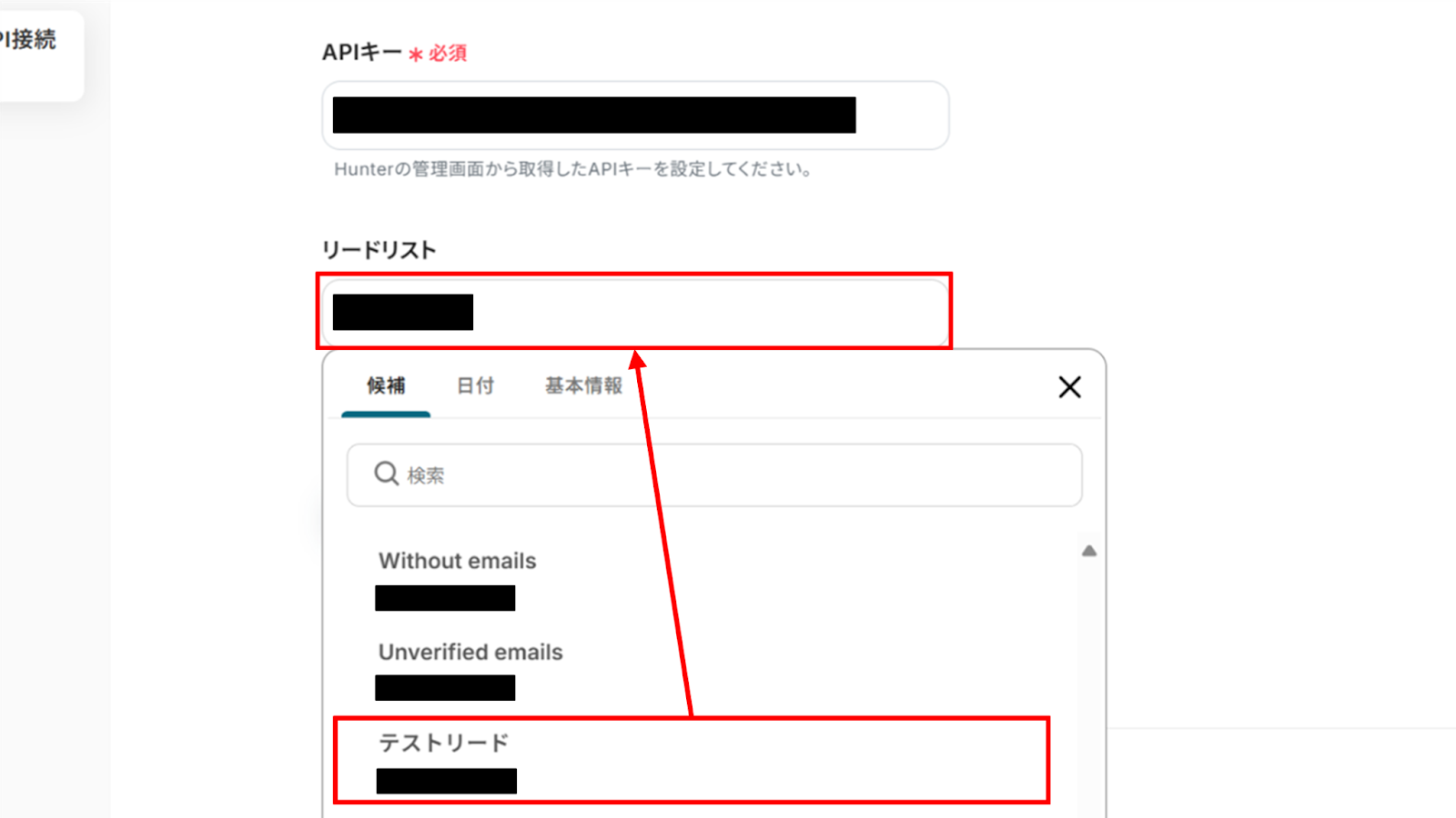 下へ進み、APIキーを直接入力し、リードリストは候補から選択します。