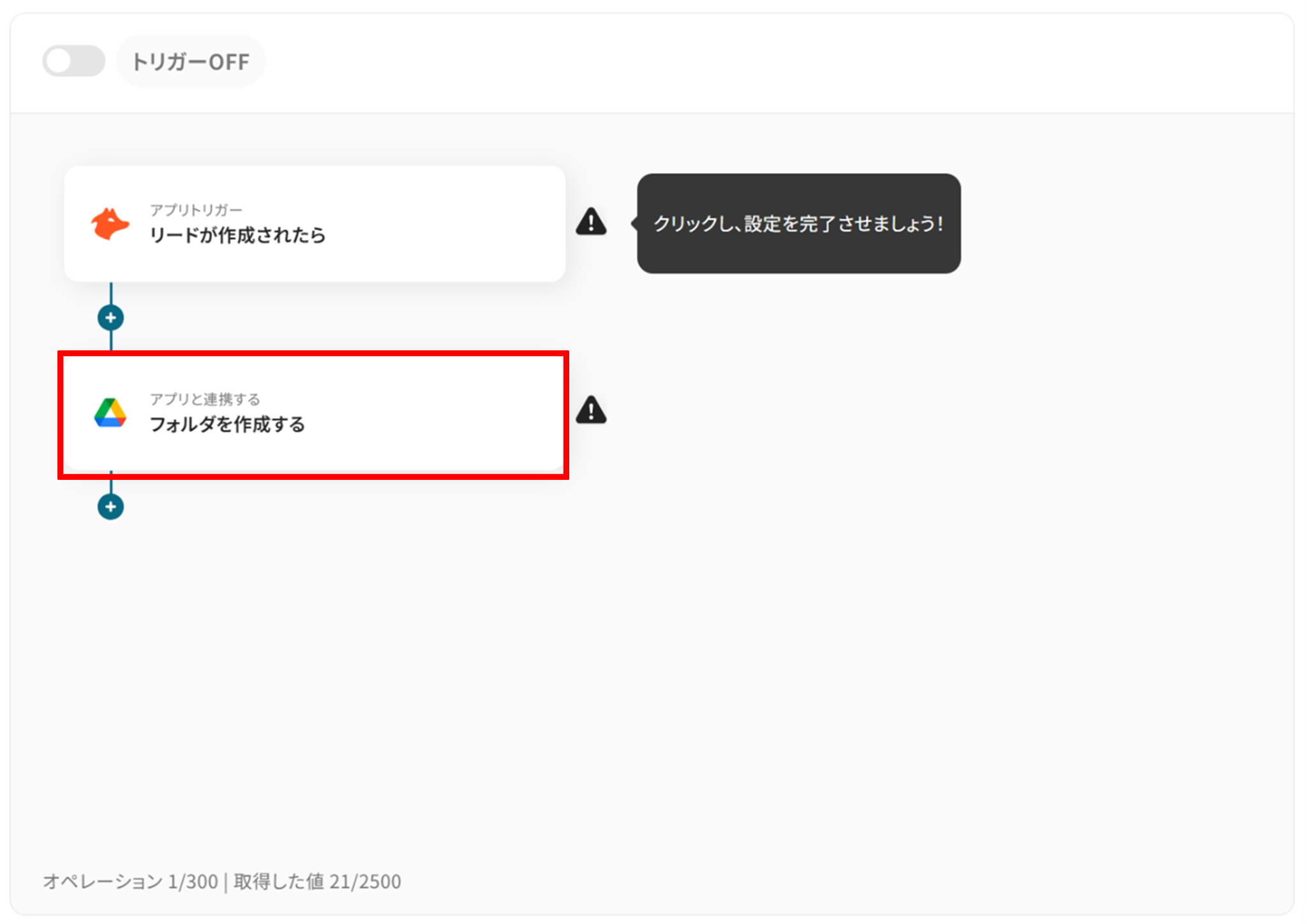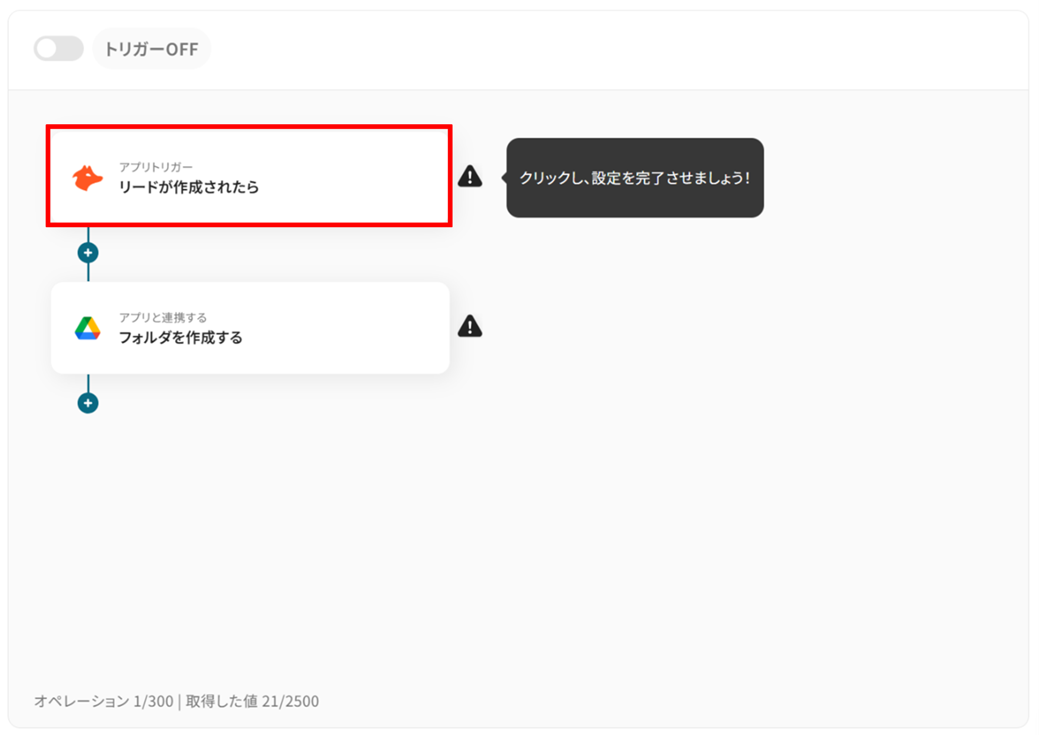 このワークフローは、HunterとGoogle Driveを連携させ、リードが作成されたタイミングで指定のフォルダを自動で作成します。