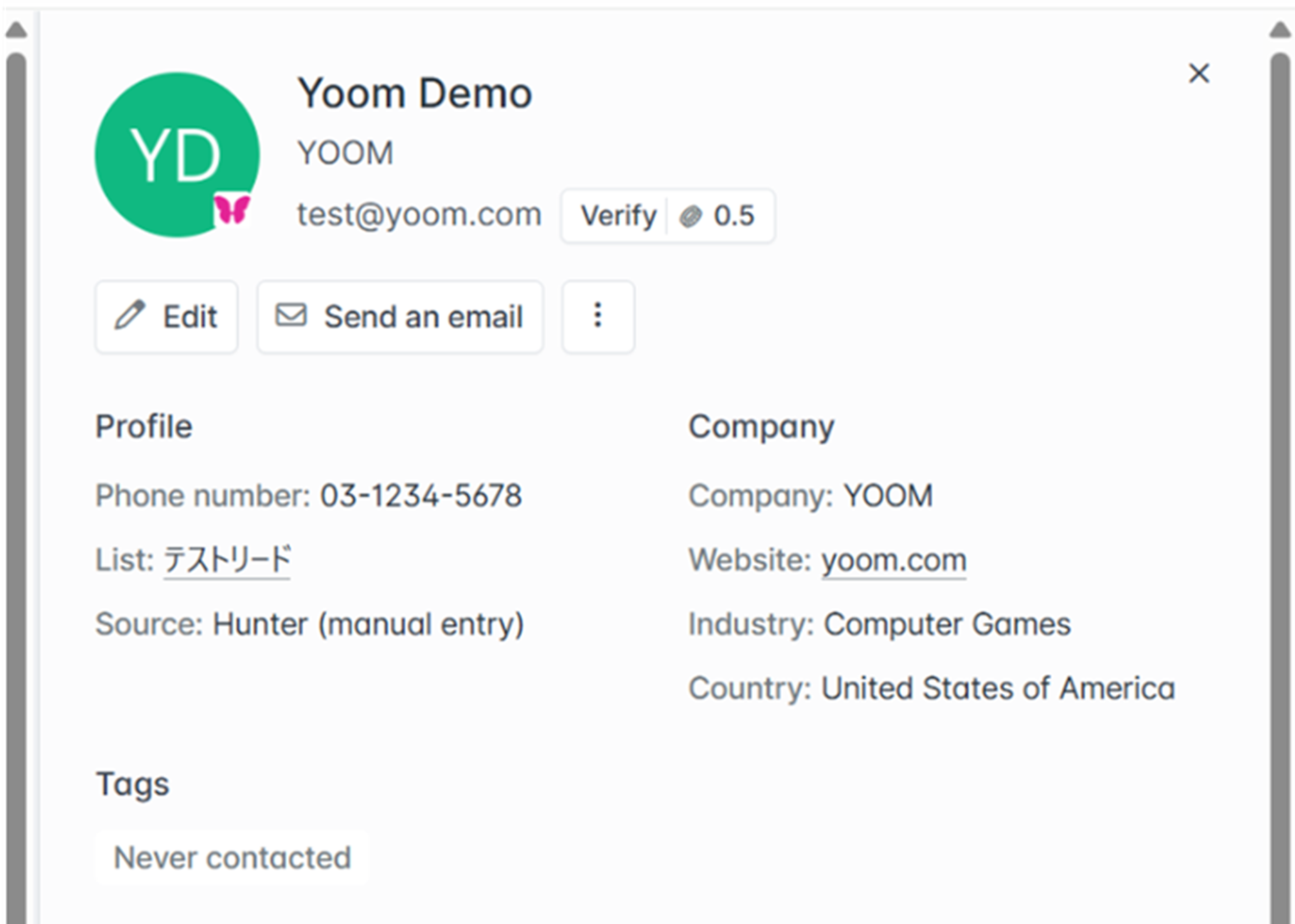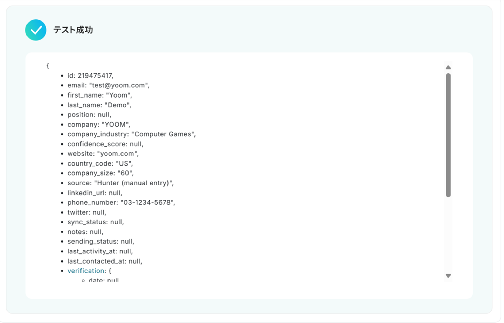 入力が終わったら「テスト」をクリックする前にHunterにテスト用のリード情報を登録します。