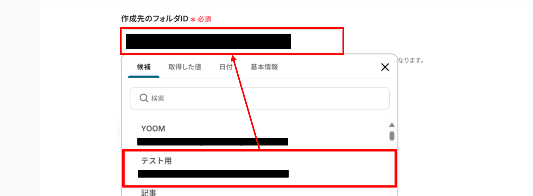 下へ進み、作成先のフォルダIDは候補から選択できます。