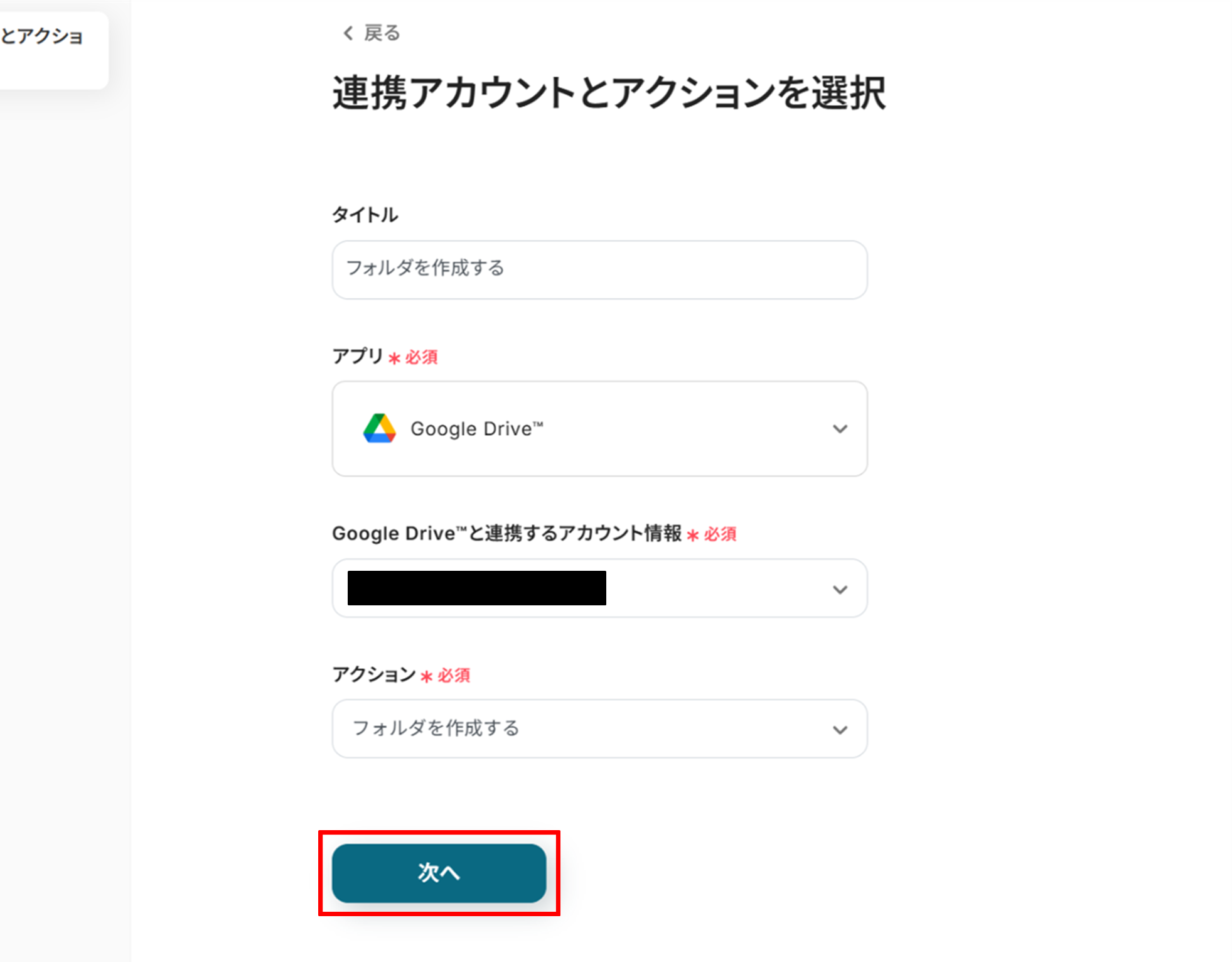 (2)「連携アカウントとアクションを選択」画面から、Google Driveと連携するアカウント情報に誤りがないかを確認し、アクションは「フォルダを作成する」のままで「次へ」をクリックします。