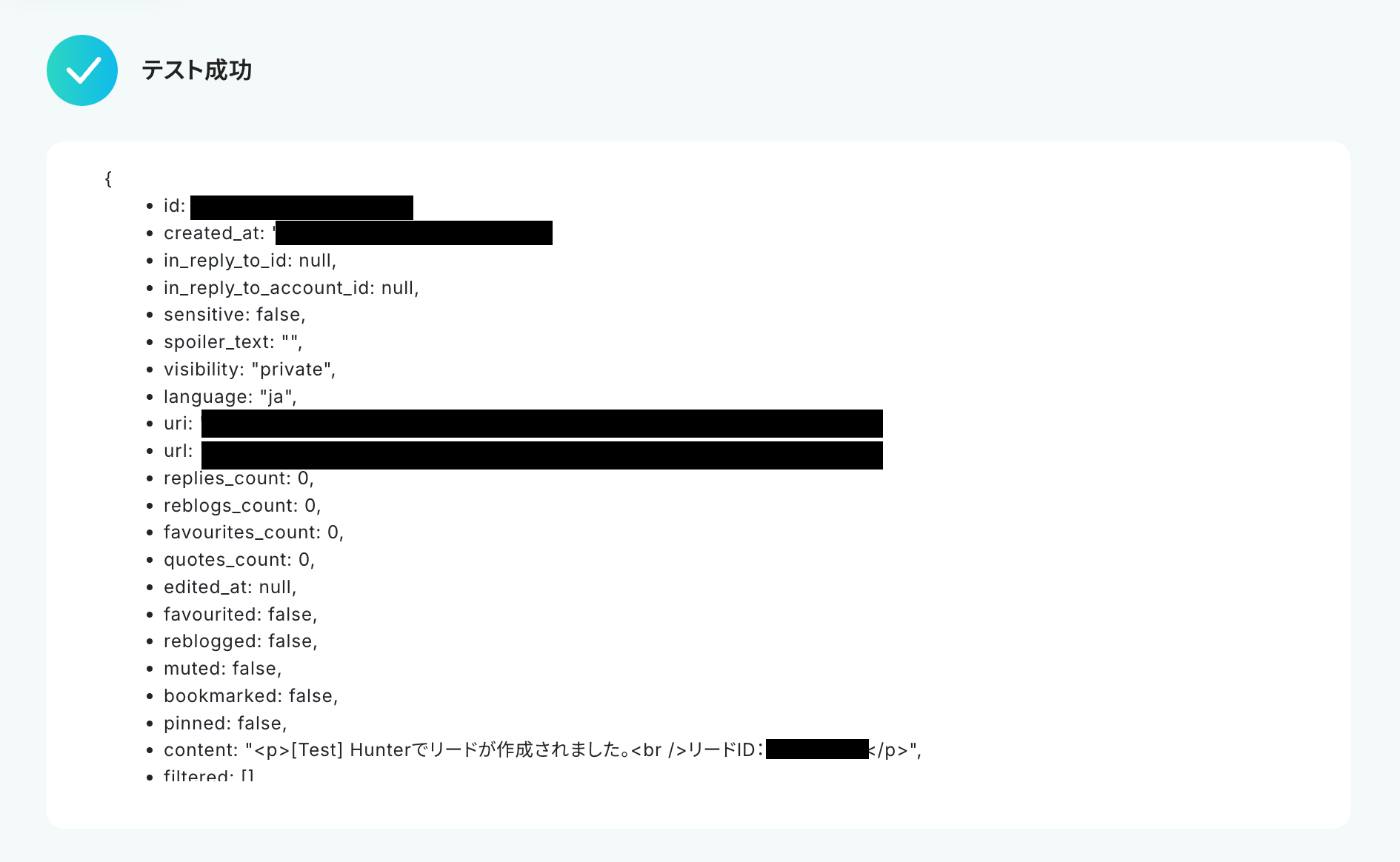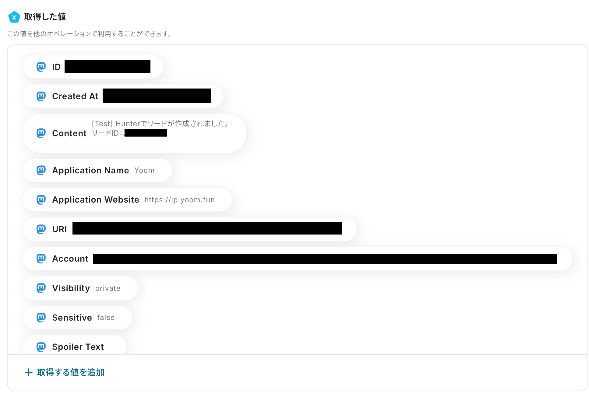 Hunterで新しいリードが作成されたタイミングで、リード情報(氏名、会社名、メールアドレスなど)をMastodonに自動で投稿(Statusを作成)できます。
