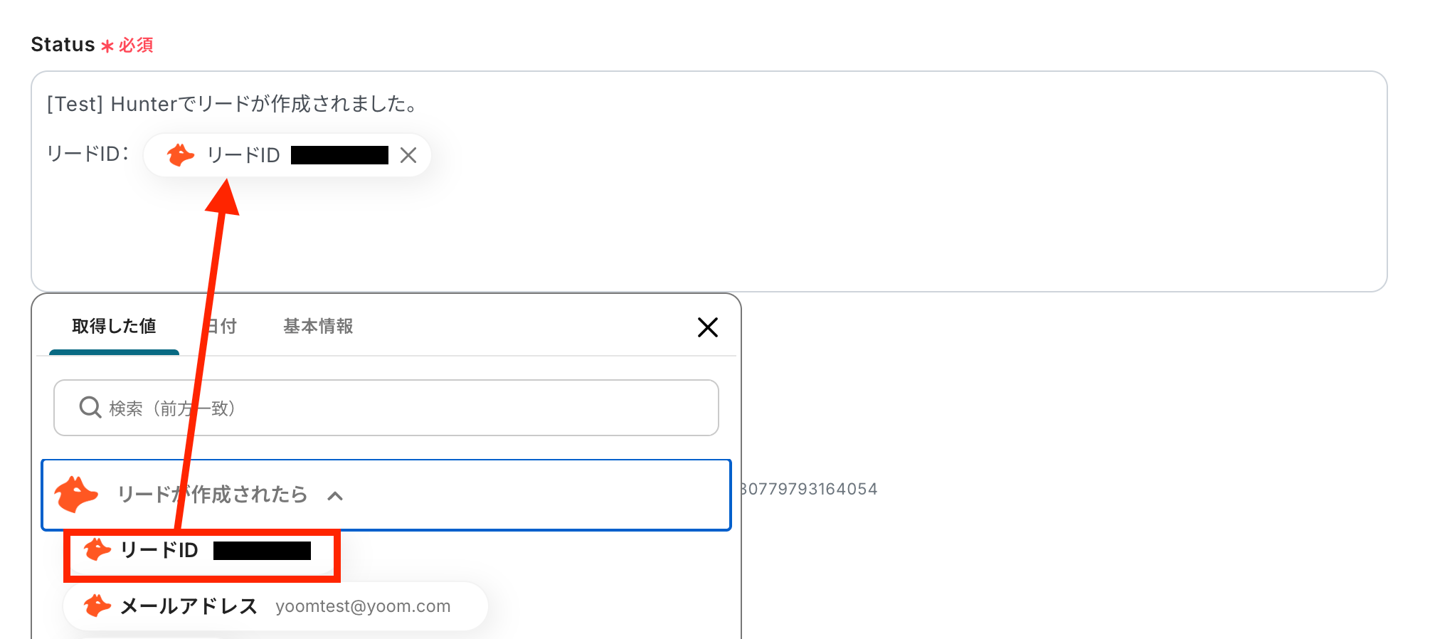 ステータスを設定しましょう!先ほど取得した値を活用して設定が可能です。 ※取得した値を活用せず設定を行うと毎回同じデータが登録されてしまうので注意が必要です!