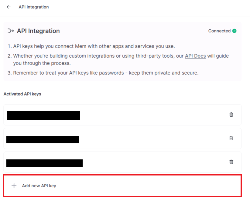 次に、「アクセストークン」を取得していきます。 Memにログイン し、左側のメニューから「Integrations」にアクセスしたら、「API」をクリックしましょう。