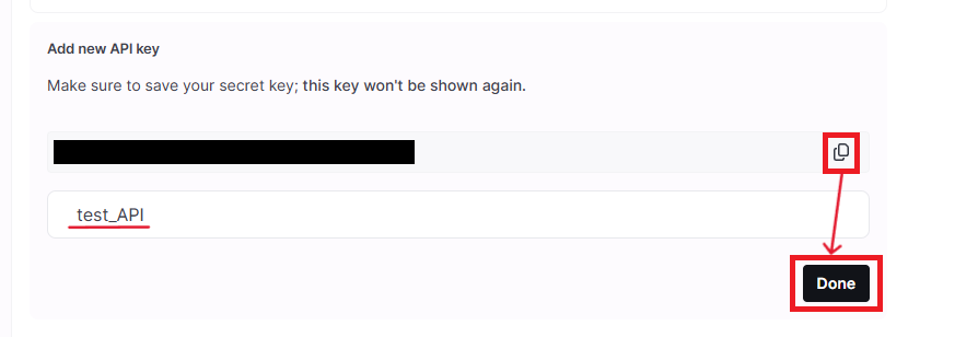 APIトークンを生成します。赤線のように任意の名称を付け、コピーしてから「Done」を押してください。