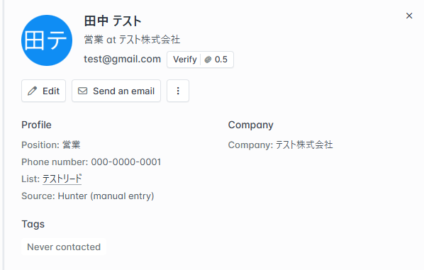 ここで、テスト操作の準備を行います。 実際にリードを用意する必要があるので、Hunterで作成してみましょう。 今回はこのようなテスト用リードを作成しました。作成が完了したら、Yoomに戻り設定を進めていきます。