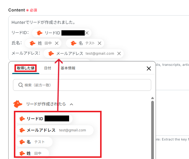 API接続設定を行います。「Content」は、入力欄をクリックして表示される取得した値から選択してください。 取得した値を活用することで、固定値ではなく、トリガーが実行されるたびに最新の情報が反映されます。