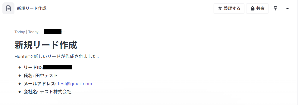 Hunterでリードが作成されると、そのリード情報を基にしたノートが自動でMemに作成される ので、手動でノートを作成する手間が省け、リードに関する情報を一元的に、かつ迅速に管理できるようになります。