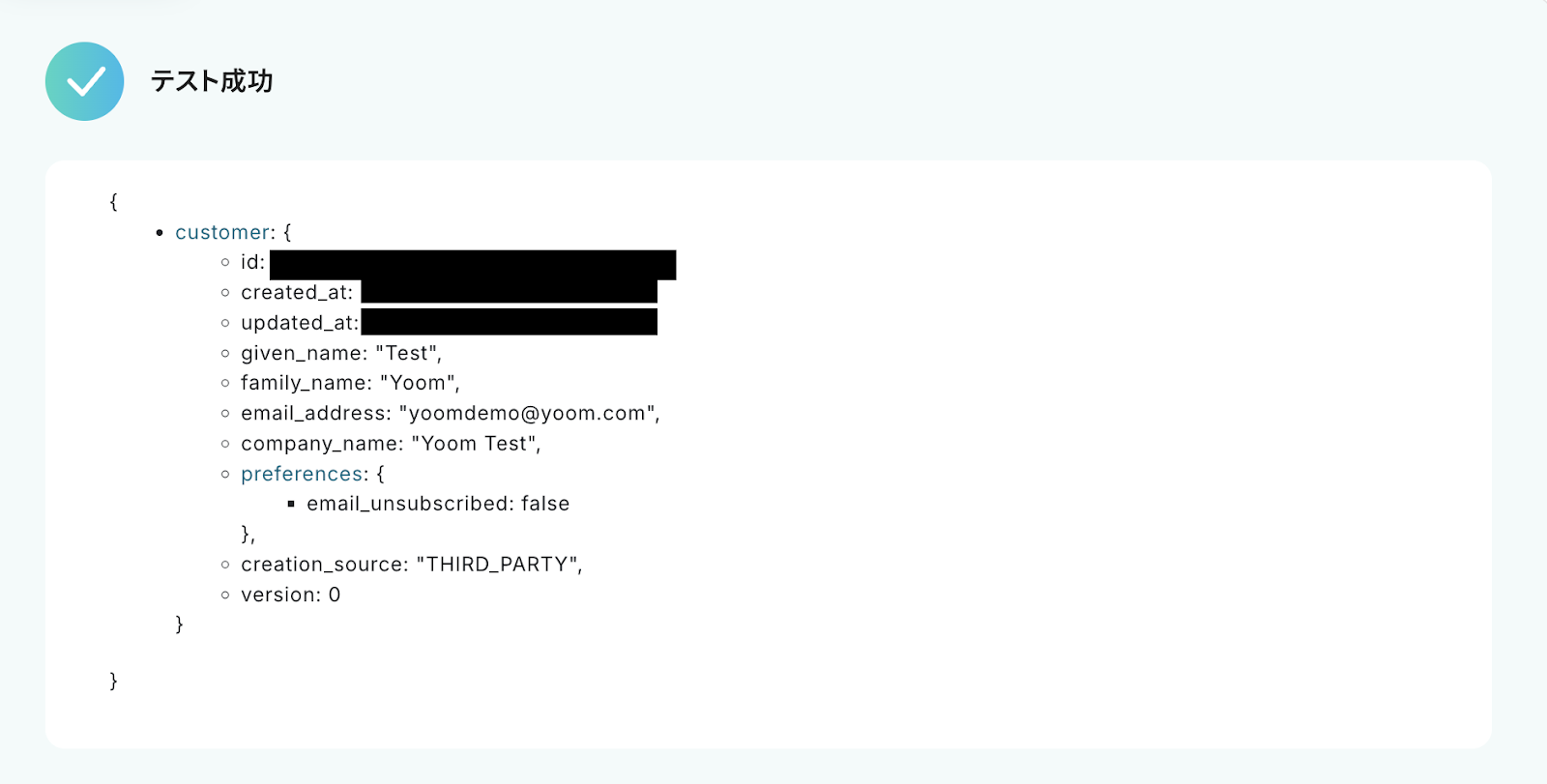 「テスト成功」と表示が出たら、アウトプット(取得した値)が取得されます。