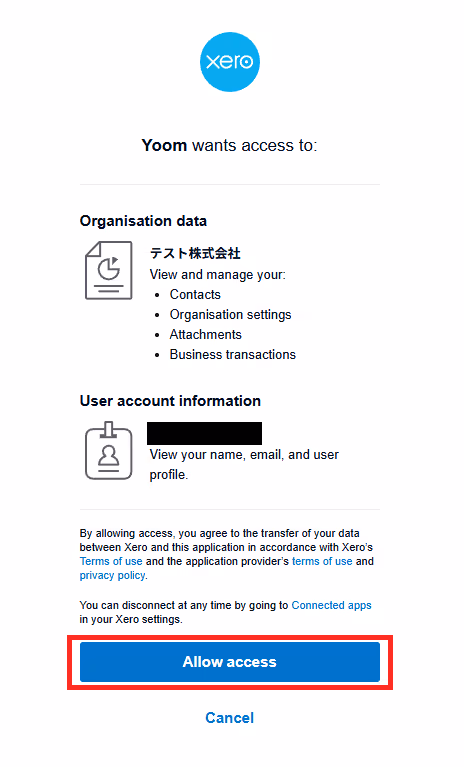 Xeroと連携するアカウントに間違いがないかを確認し、「次へ」をクリックしましょう。