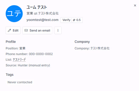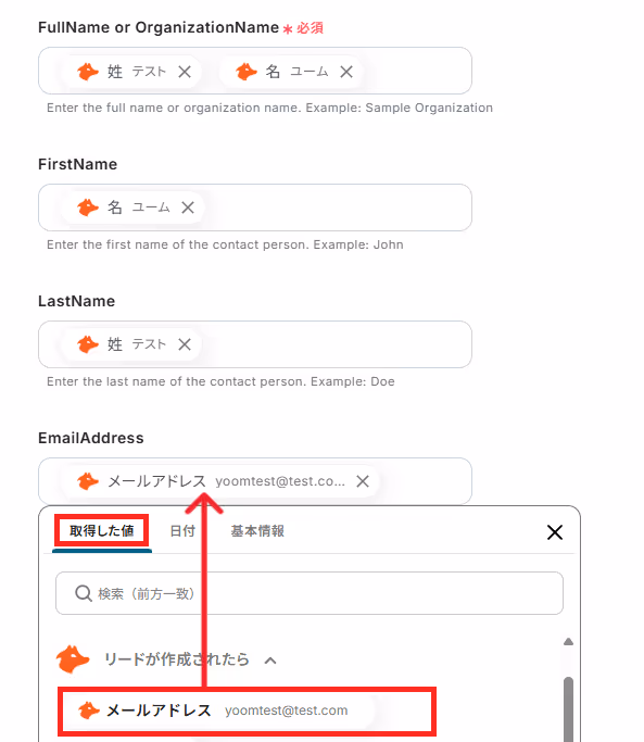 今回はこのようなテスト用リードを作成しました。作成が完了したら、Yoomに戻り設定を進めていきます。